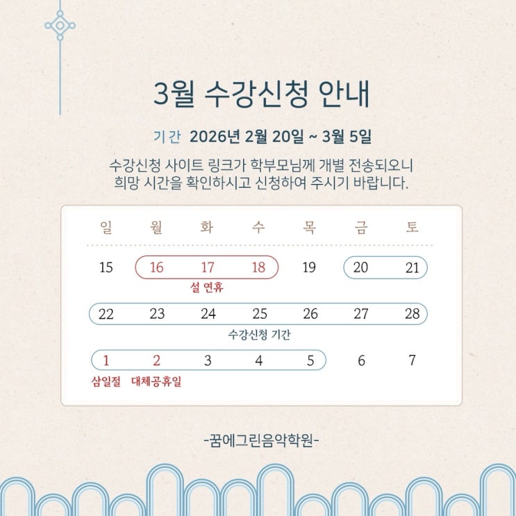 지족동 꿈에그린 음악학원 - 2026년 3월 수강신청 기간안내