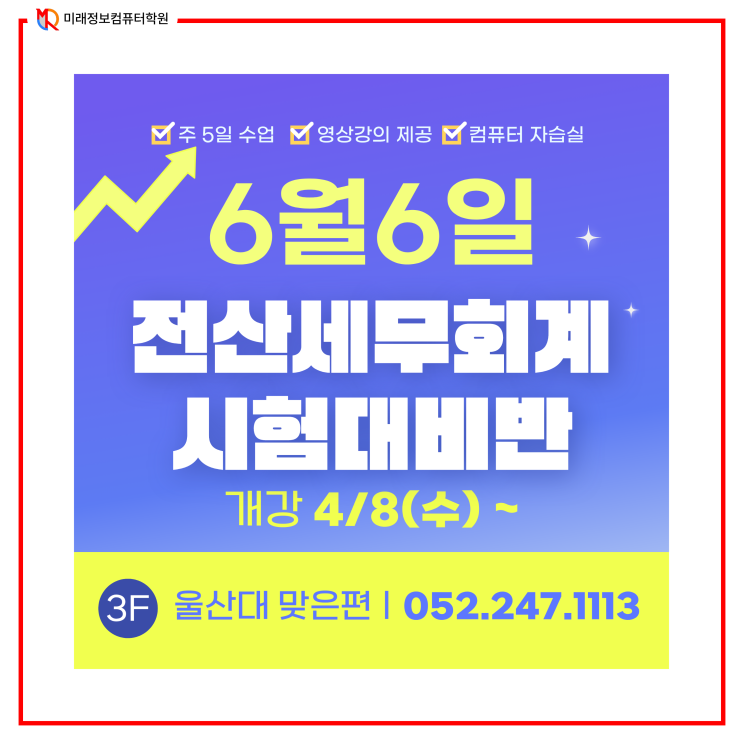 안녕하세요! 울산 취업 준비생들의 든든한 파트너, 미래정보컴퓨터학원입니다 오늘은 전산세무회계 자격증 취득을 목표로 하시는 분들에게 최적의 타이밍을 가진 과정을 소개해 드리려고 해요 (((o(*゚▽゚*)o))) 바로 저희 학원이 야심차게 준비한 [6월 6일 전산세무회계시험 대비반] 입니다! 많은 분들이 상담 전화로 "회계를 전혀 모르는데, 초보자도 따라갈 수 있나요?" 라고 여쭤보세요. 결론부터 말씀드리면, 네, 충분히 따라갈 수 있습니다! ⏰ 6월 6일 시험, 지금이 바로 합격의 시간인 이유! 저희 [기초부터 전산회계 1급 + 전산세무 2급] 과정의 일정을 보세요! • 훈련 기간: 2026년 4월 8일 ~ 2026년 6월 4일 • 시험....... <img src="https://blogthumb.pstatic.net/MjAyNjA0MDJfMjIg/MDAxNzc1MTExNjkzMzE5.zRsBvmevxm8ILJTrWTye4D-s4qcd4Ejzdc3SUkMdHz0g.MxfluvOyAHERy6Q5QWSJMdVx1prRGJ-UmIIiW9qfwV0g.PNG/1-2471113.png?type=s3" />
