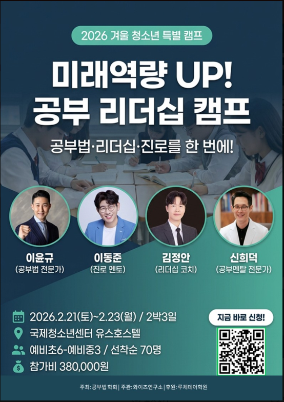 겨울방학, 아이의 공부가 달라지는 2박 3일 미래역량 UP! 공부 리더십 캠프 참가자 모집 중입니다! 요즘 아이들은 공부를 안 해서가 아니라 방법을 몰라서, 그리고 멘탈과 루틴이 부족해서 무너지는 경우가 정말 많습니다. [ZOOM 온라인 설명회도 함께 진행합니다] 캠프가 궁금하신 학부모님들을 위해 ZOOM 설명회를 진행합니다 설명회 내용 캠프 프로그램 구성(공부법/리더십/진로/멘탈) 일정/숙소/운영 방식 안내 아이가 얻을 수 있는 변화 포인트 신청 방법 및 Q&A 설명회 일정 2026년 1월 28일(수) 저녁 7시 30분 Zoom 회의 참가 https://us06web.zoom.us/j/82624911190?pwd=9glKvVfG <img src="https://blogthumb.pstatic.net/MjAyNjAxMjNfMjE1/MDAxNzY5MTQ4NTQyMzgz.pmnqykc3xrXO1Hj-LYBgYSTINFEagrAltu9skwURQ4Eg.lvW5Sv3ZCMjI5f15hDpZK8BM_D2snQ7pHn2r6kZ1n8wg.PNG/%B0%DC%BF%EF%C4%B7%C7%C1.png?type=s3" />
