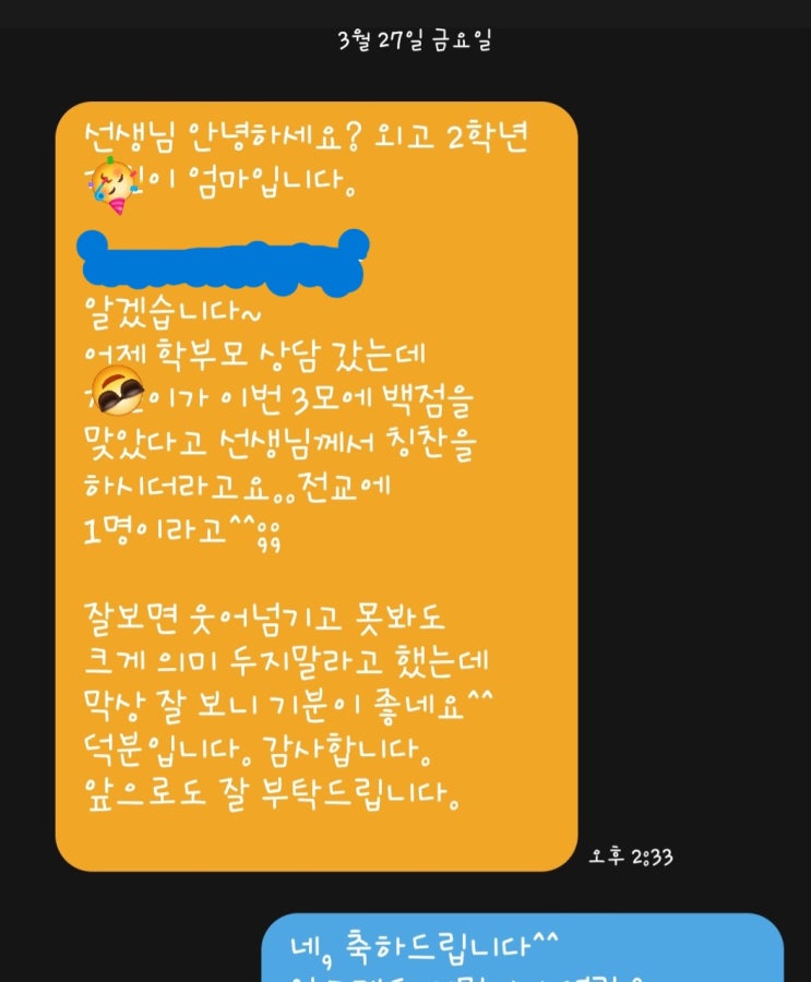 벚꽃이 서서히 모습을 드러내는 3월 말입니다. 벚꽃과 함께 반가운 소식이 있었습니다. 바로 울산외고 2학년 서00 학생이 3월 모의고사 국어 성적이 전교에서 유일하게 백점을 받았다는 소식입니다. 학생 어머님과 나눈 문자입니다. 역시 울산외고 국어 전문 학원답게 또 한 번의 성과를 만들었습니다. 학생에게는 축하의 선물로 치킨 쿠폰을..... 이번 일을 계기로 국어에 자신감을 가지고 더욱 발전하는 계기가 되었으면 합니다. 울산외고1, 2, 3학년 여러분!! 국자감 국어전문 학원으로 오셔서 후회없는 결과를 만들어 보시길 바랍니다. 울산외고 100명의 학생이 국자감을 다니고 있다는 것은 그만큼 울산외고를 잘 알고, 잘 가르친다는 것입....... <img src="https://blogthumb.pstatic.net/MjAyNjAzMjhfMTYz/MDAxNzc0NjU1MDk1NjQ3.pDoNebYCgtUde8IaCkvMzCJQYwep0hqw9hMzzSPg2pYg.Au0I3U6D8CGUpHsfNC-1zJG49X1h5Ka69Bs2b2JFIhIg.JPEG/%BC%AD%C1%F6%B9%CE_3%B8%F0_%B9%E9%C1%A1_%BC%F6%C1%A4.jpg?type=s3" />