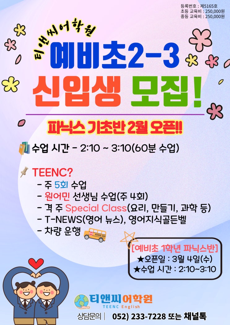 초등부 Phonics(파닉스) 기초반 2026학년도 신입생을 모집하고 있습니다. 2월 / 3월 오픈으로 진행중이니 영어 학습을 시작하고 싶은 친구들은 원으로 또는 카카오톡 채널로 연락주세요 :) <img src="https://blogthumb.pstatic.net/MjAyNjAxMjJfMTgg/MDAxNzY5MDU5NzMwNTU1.u9OqfWh6M3u2xkt6o1huAjyPd6YFlk_0yQdMp-heQFog.tvk7LQIDMgzX1OnvTYF82K8GMdUrk66EwDWXaXs2eQcg.JPEG/%C1%A6%B8%F1%C0%BB-%C0%D4%B7%C2%C7%D8%C1%D6%BC%BC%BF%E4__%BA%B9%BB%E7%BA%BB-_1_-001.jpg?type=s3" />