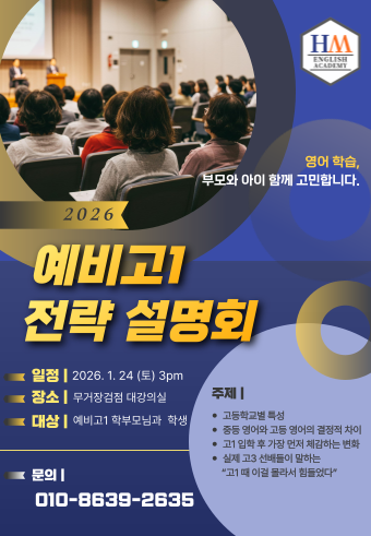 예비고1 시기는 고등학교 입학을 앞두고 가장 많은 질문이 쏟아지는 시기입니다. 막연한 불안이 아니라, “이제 정말 고등 영어가 시작된다”는 현실을 마주하게 되는 때이기도 합니다. HM잉글리쉬의 예비고1 전략 설명회는 이 시점을 의도적으로 선택했습니다. 학교가 정해지기 전의 추상적인 방향 제시가 아니라, 학교 발표 이후, 실제 고등 환경을 기준으로 한 설명이 가장 정확하다고 판단했기 때문입니다. 고등 영어는 ‘설명’보다 ‘경험’이 먼저입니다 이번 겨울, HM잉글리쉬에서는 예비고1 내신 특강을 통해 아이들이 고등 영어 내신을 실제 시험 형태로 먼저 경험했습니다. 특강 이후, 아이들의 반응은 분명했습니다. “문장이 너무 길....... <img src="https://blogthumb.pstatic.net/MjAyNjAxMTVfMTc1/MDAxNzY4NDQ1MDU5NDI0.JiS7A15Gl7rTIcA2PqWJub6daj06KYuU_amHC9zTN6Eg.aHqOxLsnpw_4fWDbqRjQ_-mo0Eu7BWrfi1mZMVKlLSog.PNG/%BC%B3%B8%ED%C8%B8%C6%F7%BD%BA%C5%CD-002.png?type=s3" />