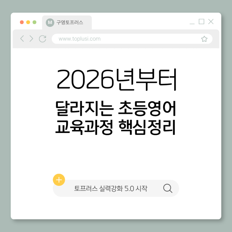 구영리 영어학원 토프러스에서 알려드리는 2026년 영어교육의 큰 변화 2026년, 초등 전 학년 '2022 개정 교육과정' 전면 적용 2022 개정 교육과정의 가장 큰 이슈는 고교학점제와 그에 따른 평가방식(내신/수능)이었습니다. 이는 공교육경쟁력제고방안 발표 시점부터 제가 꾸준하게 학부모님께 안내 드린 내용입니다. 순차적으로 적용중인 교육과정은 올해 초등 5,6학년까지 적용되며 큰 틀이 마무리 됩니다. 자세한 내용이 궁금하시면 211-1102번으로 전화주세요. 상세히 설명 드리겠습니다. 올해(2026년) 3월부터는 기존 1~4학년에 이어 초등 5, 6학년까지 새 교육과정이 적용됩니다. 이로써 초등학교 전 학년이 2022 개정 교육....... <img src="https://blogthumb.pstatic.net/MjAyNjAxMjFfMTQw/MDAxNzY4OTgyMDkwMTg0.Rzg79SB35X0bith9xL4mscCHEYvdzCgkU7VgJAbfS5kg.wUyVyfN401wJRVLiw5UcqXtckB5tMsekQDJq5FNIt0Ag.PNG/1.png?type=s3" />