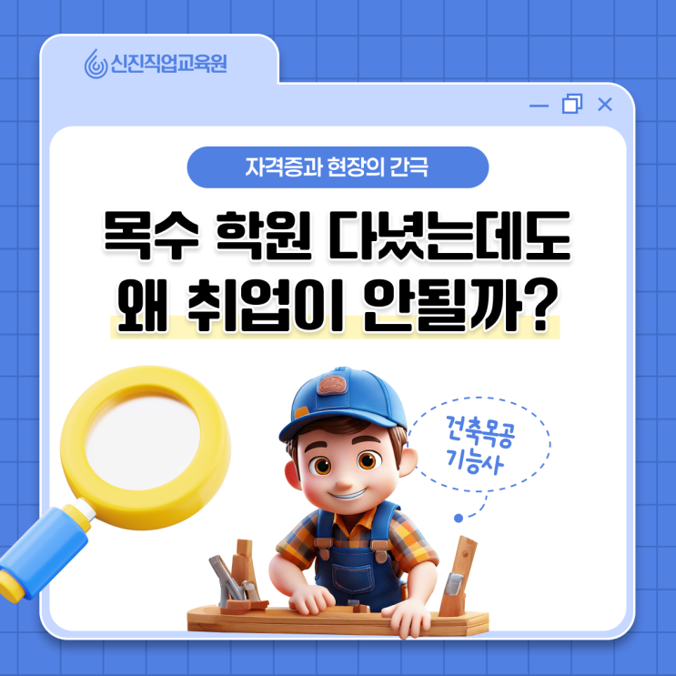 "안녕하세요, 제가 목수 학원 다니면서 건축목공기능사 자격증을 땄는데요… 현장 취업이 안되네요." 얼마 전 신진직업교육원으로 급하게 상담 요청이 들어왔습니다. 김OO씨는 몇 달간 목수 학원을 다니며 목공 자격증을 준비해 합격했고, 드디어 인테리어 목수로 커리어를 시작하려던 참이었는데요. 그런데 막상 현장에 가니 적응을 못해 결국 나오게 되셨다고 합니다. 자격증이 있다는 건 기본기가 있다는 것인데 왜 적응이 안 되는 걸까요? 오늘은 많은 예비 목수들이 모르고 지나치는, 자격증과 현장 투입 사이의 간극에 대해 솔직하게 이야기해 드리려고 합니다. <예비 목수가 함께 보면 좋은 내용> ▼ 요즘 인테리어 목수....... <img src="https://blogthumb.pstatic.net/MjAyNjAzMDVfMTk0/MDAxNzcyNjg2MTM3OTg5.ZMy6KZiQvP6OtHzUBKxodfMdGBRSnjmbd1qaF28W-xUg.j0jOFdyDrQkvwz6zy-I_GEuF9NsSWE9Ok180kduEncUg.PNG/%B8%F1%B0%F8%28%B3%B2%C4%B3%29_%281%29.png?type=s3" />