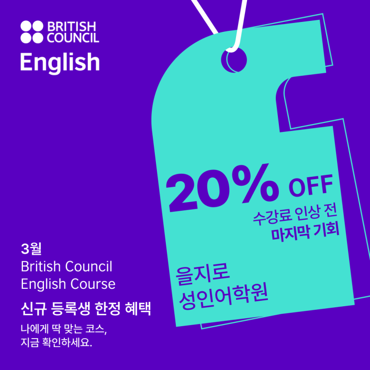 새 계절, 새 학기, 새 출발. '새롭다'라는 단어가 어울리는 3월, 주한영국문화원에서 영어 공부도 새롭게 시작해 보세요! 새로운 마음가짐으로 영어에 도전할 분들을 위해 영국문화원 을지로 센터에서 3월 한 달간 할인 이벤트를 진행합니다. 4월 수강료 인상 전 마지막 기회이니 꼭 놓치지 마세요! 이벤트 기간 2026년 3월 1일 ~ 2026년 3월 31일 혜택 대상 을지로 센터 신규 등록자 중 BCE(British Council English) 코스 80패키지 등록자 혜택 내용 수강료 20% 할인 BCE(British Council English) 코스란? 영국문화원의 BCE(British Council English) 코스는 업무, 학업, 사회적 커뮤니케이션 능력 등 개인의 목표에 맞춰 학습 프로....... <img src="https://blogthumb.pstatic.net/MjAyNjAzMDZfMjUg/MDAxNzcyNzYwMzYwMDE1.1pOYKZWaDzC4ypYmAfJz0-dWEmsYOefDZwPrYYe6oH8g.mECm3ogwVL3OVQ0yd-lZIewsJjctrsMf8xldLO19gvkg.PNG/Meta_1080_1080.png?type=s3" />