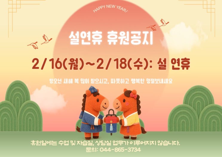 안녕하세요. 아이들의 하루하루 성장을 함께하는 생각하는 황소(세종)입니다. 어느덧 가족과 함께 따뜻한 시간을 보내는 소중한 명절 설 연휴가 다가왔습니다. 새해에도 아이 한 명 한 명의 속도를 존중하며, 조급하지 않게, 그러나 멈추지 않고 꾸준히 성장할 수 있도록 지도하겠습니다. 가정마다 건강과 웃음이 가득하시길 바라며, 2026년에도 아이들의 성장을 믿고 맡길 수 있는 학원으로 늘 최선을 다하겠습니다. 새해 복 많이 받으세요. 감사합니다. 생각하는 황소(세종) 학원 드림 <img src="https://blogthumb.pstatic.net/MjAyNjAyMDZfMjQ4/MDAxNzcwMzgxMDMyMTk1.zi7N1AYQKqsgJVJEgiOfGf0hJYyVVAqr4PhRDowLfQsg.VHszda_HdhQQ3BEehOxeu230-2SnLEo4TolLjpcQHq8g.JPEG/%C1%A6%B8%F1%C0%BB_%C0%D4%B7%C2%C7%D8%C1%D6%BC%BC%BF%E4._%288%29.jpg?type=s3" />