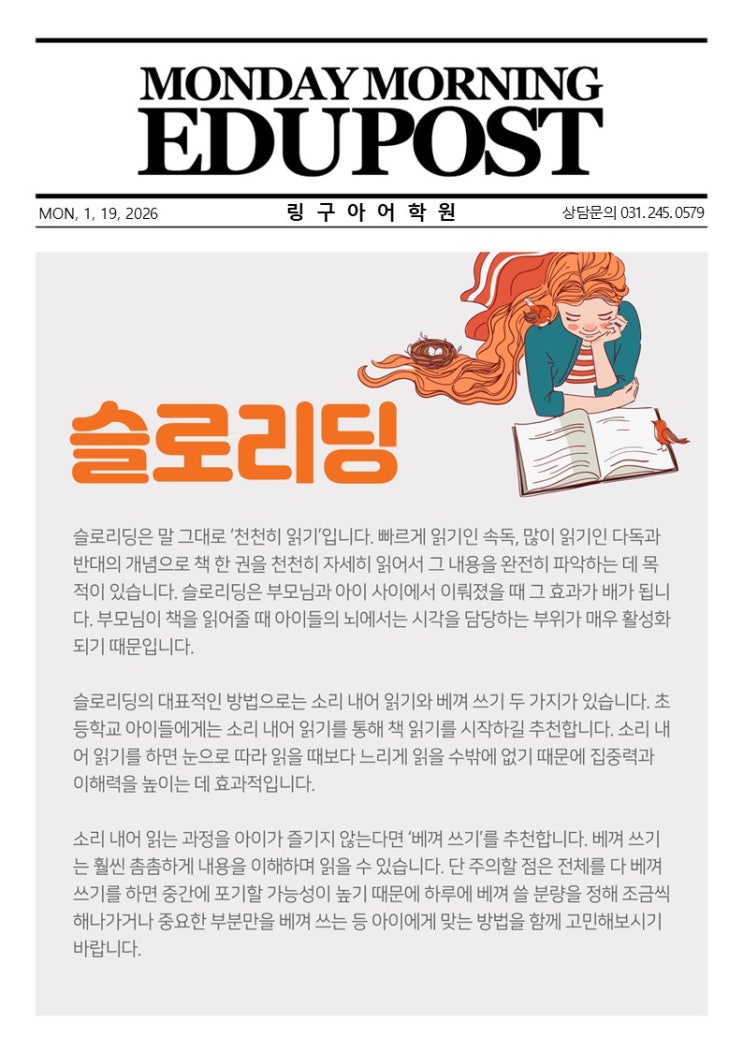여러가지 책을 읽는 방법들이 있지만 오늘은 "슬로리딩"에 관한 팁을 드립니다. 느리게 읽기는 책 한 권을 천천히 자세히 읽어서 그 내용을 완전히 파악하는 데 목적이 있습니다. 숏폼에 익숙한 우리 아이들이 책읽는 습관 만큼은 서둘지 않으면 좋겠습니다. 천천히, 느리게, 생각하며 책을 읽는 습관은 학업 능력향상에 분명 큰 도움이 될 것입니다. 오후부터 많이 추워진다고 합니다. 몸도 마음도 따뜻하시기를 바랍니다^^ <img src="https://blogthumb.pstatic.net/MjAyNjAxMTlfMjc3/MDAxNzY4Nzk4NzY5NDIx.Jx11nbdLNujVjt7eb3Mpzf3k9I--3XKTw6yWpkoUnK0g.OeydmN8FUAsoaneX0d_3zncAbEOfXLSSHgdz2fHMEnsg.JPEG/1768797765936.jpg?type=s3" />