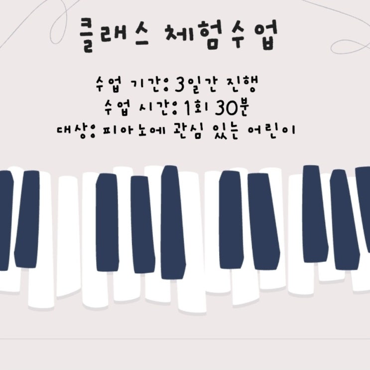 클래스 체험수업 안내 피아노를 배우고 싶었지만 시작이 망설여졌던 친구들을 위한 좋은 기회! 방학을 맞아 3일간 · 하루 30분씩 진행되는 피아노 체험수업을 준비했습니다. (방학기간중에만 신청가능 합니다) ✔ 피아노가 처음인 친구도 ✔ 예전에 잠깐 배워본 친구도 ✔ 정규 레슨 전 체험이 필요한 친구도 모두 환영합니다. 짧지만 알차게, 피아노의 즐거움을 직접 느껴볼 수 있는 시간✨ 방학 중 새로운 도전, 피아노와 함께 시작해보세요. 체험수업문의 010.6508.0902 #탑동피아노 #탑동피아노학원 #효탑초피아노학원 #콩쿨전문학원 <img src="https://blogthumb.pstatic.net/MjAyNjAxMjdfMTMz/MDAxNzY5NTI1NjQ3MTY0.H2QaUF4IjTQR0F0bliL-cy2HxO_l0zSmnPtvL86tT1Yg.W74dD84nRQDiA2l7ICc8jilWB2I6uMn6vU8P0fqXqJkg.JPEG/900%A3%DFBandPhoto%A3%DF2026%A3%DF01%A3%DF27%A3%DF23%A3%DF53%A3%DF56.jpg?type=s3" />