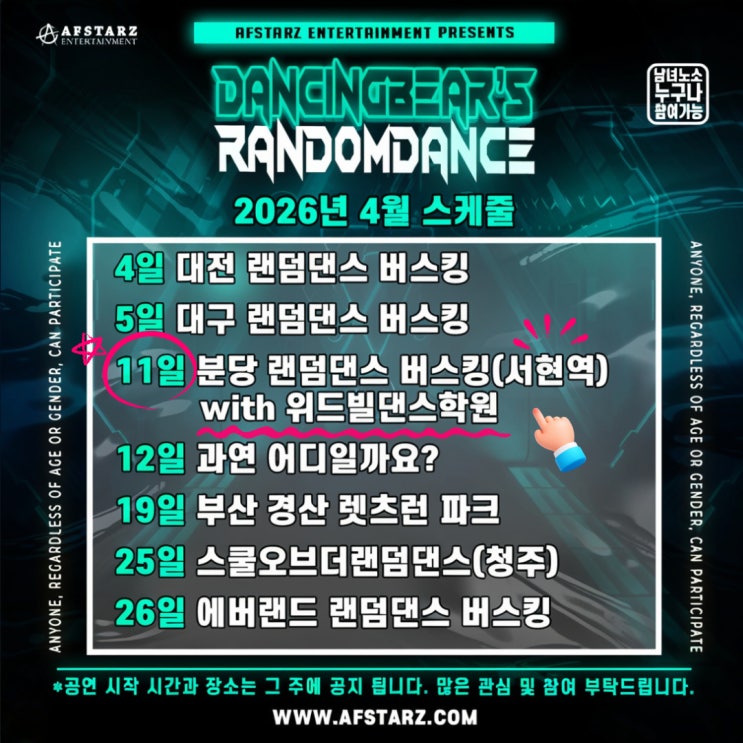 안녕하세요 위드빌댄스학원 분당본점 / 위례중앙점 입니다 :) 여러분! 엄청난 소식을 가지고 돌아왔습니다! 사근한 봄을 맞아 콧바람을 쐬고 싶은 모든 분들께 드리는 특급 이벤트!✨ 유튜버 이자 댄스 버스킹의 살아있는 전설, 춤추는 곰돌과 분당/위례 최고의 댄스학원 위드빌이 다시 한번 뭉칩니다! 세번째로 이어지는 이 이벤트, 어서 확인하러 가보실게요! 유튜브 (춤추는 곰돌) 72만명, 유튜브(춤추는 곰돌의 랜덤댄스_ 353만명, 틱톡 450만명, 아프리카TV 24만명 엄청난 구독자 수를 자랑하는 메가 크리에이터, 춤추는 곰돌과 위드빌의 세번째 만남❤️ 상세일정 ✔️DATE : 2026. 04. 11 (토) 오후 4....... <img src="https://blogthumb.pstatic.net/MjAyNjA0MDJfMjc3/MDAxNzc1MTE1MDM0Mjcx.phCUp3_dAKdRgW-XK4EyxpkMPgioKuR38rbaka8NbIMg.S5Zgc6ZwSmM7dN_S_jGqRg_ivJaIiPP-cD9kXHhiSjgg.JPEG/1775114620496_%281%29.jpg?type=s3" />