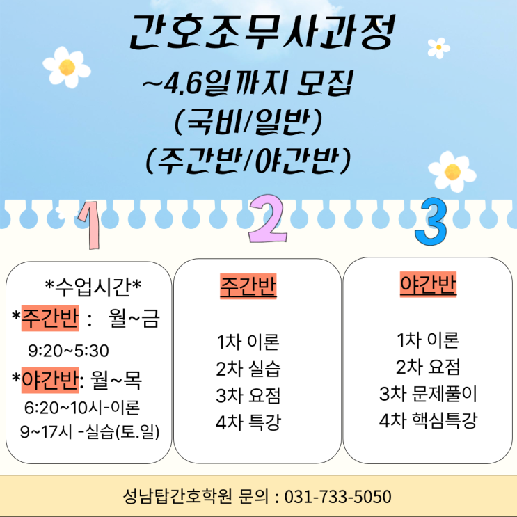성남에서 간호조무사 준비는 지금이 기회 취업이 빠른 자격증을 찾고 계신가요? 안정적인 의료직으로 새로운 시작을 준비하고 싶으신가요? 지금 바로 성남탑간호학원 개강반에 도전하세요! 성남탑간호학원만의 특별한 장점 ✔ 합격 중심 커리큘럼 운영 기초부터 국가고시 대비까지 체계적인 단계별 수업으로 처음 시작하는 분도 걱정 없이 준비 가능 ✔ 실무 중심 교육 강화 병원에서 바로 활용 가능한 주사실무·간호실습 중심 교육으로 취업 경쟁력 상승 ✔ 취업 연계 시스템 수료 후 병원·요양기관 취업 연계 지원으로 빠른 취업 가능 ✔ 직장인 맞춤반 운영 주간반·야간반 선택 가능으로 시간 부담 최소화 ──────────────....... <img src="https://blogthumb.pstatic.net/MjAyNjAzMjdfMTI2/MDAxNzc0NjA5NjQxMTI2.IZt3eN9a_uABgF5h6jBrFSyEJcQRXpRtx4wU-9z7DLIg.sGJnlEI5gs-ZXFDE1OXncrfn9ge4PsLN7dOHeo5vvqkg.PNG/6.png?type=s3" />