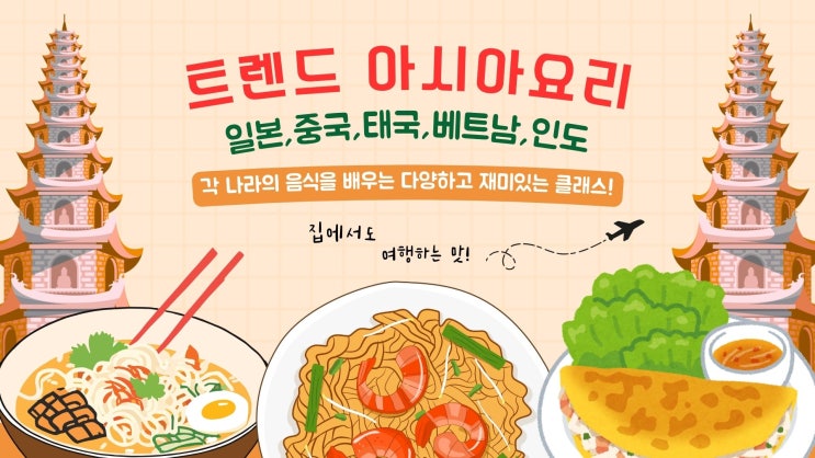 안녕하세요, 성남요리학원입니다. 요즘 여행 가기 쉽지 않죠? 유류할증료가 오르면서 항공권 가격도 부담되다 보니 선뜻 손이 안 나가는 것 같아요. 그래서 '현지에서 먹던 그 맛'을 직접 배워볼 수 있는 특별한 과정을 준비해 보았습니다! 트렌드 아시아 요리 (일본, 중국, 태국, 베트남, 인도) 작년에 진행했던 아시아 요리 과정이 만족도가 높아서 자연스럽게 재수강 문의가 이어졌었는데요 올해는 더 탄탄하게 구성한 트렌드 아시아 요리 과정으로 찾아왔습니다 일본, 중국, 태국, 베트남, 인도까지 다양한 나라의 맛있는 음식들을 메뉴로 구성해서 실제로 집밥이나 손님 접대에도 좋은 활용도 높은 수업으로 만들었어요. 한마....... <img src="https://blogthumb.pstatic.net/MjAyNjA0MDJfMTY5/MDAxNzc1MDk4ODk4MDc1.O0zzFqTKvEm9AQ3nERPqn6b67WR9pc1nCCqqqZwZHU8g.7xIfpmopMAUpe6Z6MqrEurSE8Xx8-VDWfcAngA1Fh9Ug.JPEG/Orange_Illustrated_Vietnamese_Food_Presentation.jpg?type=s3" />
