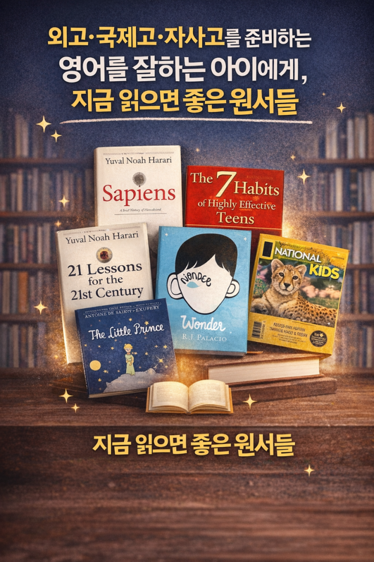 외고·국제고·자사고의 내신 영어는 교과서 해석 능력을 넘어, 다양한 지문을 이해하고 변형하며 자신의 생각을 말과 글로 표현하는 능력을 요구합니다. 이런 역량은 초등 고학년 시기의 독서 경험에서 가장 자연스럽게 만들어집니다. 1. 사고력을 키우는 인문·사회 원서 Sapiens (청소년판 권장) 인류의 역사와 문명의 흐름을 다루는 책으로, 단순 정보 전달이 아니라 “왜 인간은 이렇게 살아왔는가?”를 끊임없이 묻습니다. 사고력: 하나의 사실을 여러 관점에서 해석하는 힘 독해력: 긴 설명문 구조를 따라가며 핵심을 파악하는 능력 표현력: ‘인류·사회·미래’와 같은 큰 주제를 자신의 말로 정리하는 연습 → 외고·자사고에서 자주 등장하....... <img src="https://blogthumb.pstatic.net/MjAyNjAxMTZfMjkz/MDAxNzY4NTYyODk4NTg1.EYBnv9L6pHVsHGBdSrFZO1leKFnOOEE5trawpKNerD0g.7kZXkx7nYJMY7B7dz5Wn0oz3hykLAXvQOMm6lqE0GaMg.PNG/900%A3%DFfile%A3%DF0000000081747208b6998e7ed09513d7_%A3%A81%A3%A9.png?type=s3" />