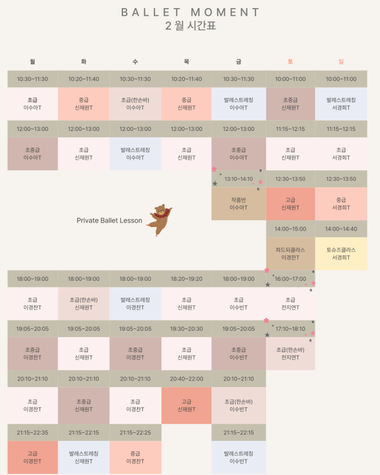 서현 발레모먼트 2월 시간표와 휴강 달력