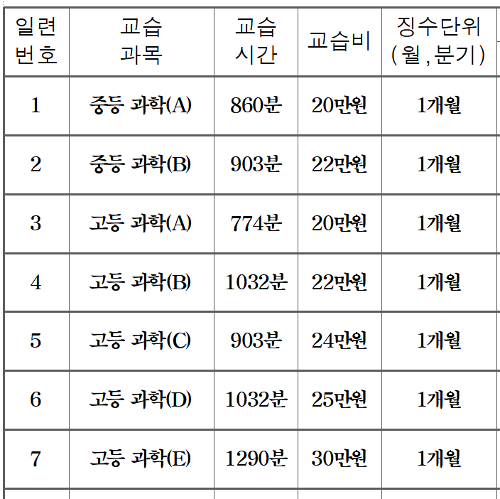 3월의 잔디밭 보습학원 교습비