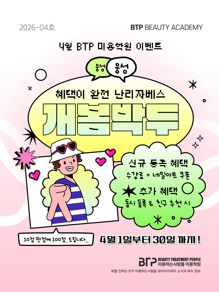 4월 이벤트 벌써 길가에 꽃들이 활짝 피어나고 있는것 같습니다! 봄바람이 살랑거리는 4월 BTP 미용하는사람들 의정부 미용학원에서도 4월을 맞이하여 풍성한 이벤트를 준비해 봤는데, 이번 이벤트 소식이 담긴 월간 미용하는사람들 4월호와 함께 소개 해 드려 보려고 합니다. 먼저 첫번째 소식은 14년 연속 미용학과 대학 수시 지원자 전원 합격 소식인데요!! 26학년도 수시 지원자 65명 전원이 합격하며 의정부 본원 1개 지점 기준으로 또 한번 새로운 역사를 써내려가게 되었습니다. 다음은 26년 상시기능사 시험 3회~4회 합격자 발표 소식인데요. 3회 시험의 경우 헤어 자격증만 무려 14명 합격생을 배출하는 놀라운 모습을 보여 주었고, 4회....... <img src="https://blogthumb.pstatic.net/MjAyNjA0MDNfMjYg/MDAxNzc1MjA0OTIzMjg4.zJqf5tVz2cHKgZRGdHOANqqB9QIXGdwWUu5tkASOcjYg.hO7Ztf3_nnbNhq6HDCs5FNFa6V0OIoZAsQun18MaESog.PNG/010.png?type=s3" />