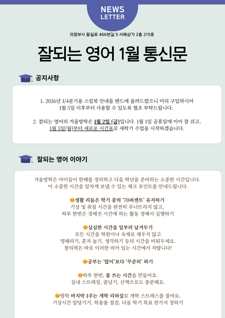 1월 5일에 신규 파닉스반이 개강되었습니다. 저희는 1년에 1개의 신규 클래스만 개설하기 때문에 늘 대기가 많은 반입니다. 2027년까지 대기가 차 있어 2028년 대기 신청만 받는 점, 양해바랍니다. 새해에도 영어로 행복한 아이들을 키워내기 위해 열심히 달리겠습니다. <img src="https://blogthumb.pstatic.net/MjAyNjAxMTFfMjUy/MDAxNzY4MTExOTM2MTM2.DUIlZA7pwIhG4fYx_702sgF4BNBF-DMmJ8RZzWmDKGwg.Jc62PsG1EQ7d3dHVdb2SlI5r7S2AqWttOk2crxkN9fEg.PNG/1%BF%F9.png?type=s3" />