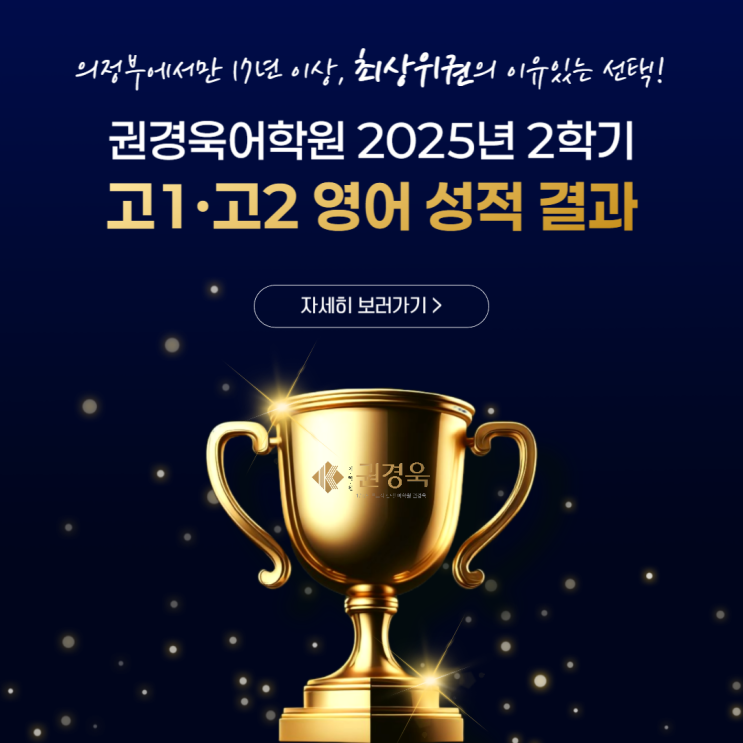 안녕하세요~^^ 의정부에서만 17년 이상, 최상위권의 이유있는 선택! 본질적 영어 실력과 단단한 학습 습관을 함께 만들어가는 영어전문 교육, 권경욱 어학원입니다. 오늘은 많은 학부모님들과 학생분들께서 기다려 주신 2025년 2학기 고1·고2 영어 내신 성적 결과를 공유해 드리려고 합니다. 결과부터 말씀드리면, 이번 학기 역시 의정부 고등 영어 내신에서 압도적인 성과를 만들어 냈습니다! 2025년 2학기 고등부 영어 내신 결과 고1 1등급 91.5% 1·2등급 100% 고2 1등급 61% 1·2등급 84% 단순히 일부 상위권 학생의 성과가 아니라, 전반적인 성취도와 등급 분포 자체가 다른 결과라는 점에서 더욱 의미 있는 성적입니다. 왜 권경욱어학원은 결....... <img src="https://blogthumb.pstatic.net/MjAyNjAxMTlfMjE5/MDAxNzY4NzgyNjg2NTUx.sMwuSIevBrK60V4J5qQa2woTjar5o5Mb0CdLXSgLrpsg.oJec41JU0Ry8Ad0AmWhIyIIRxkNlFPIHWtMRcTlqSKUg.PNG/%BD%C5%B0%EE%B5%BF_%BF%B5%BE%EE%C7%D0%BF%F8-001.png?type=s3" />