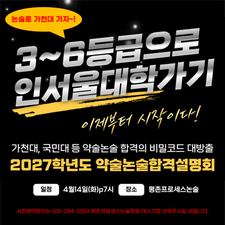 ” 4-6등급으로 인서울하기 “ 약술논술이 필요한 학생 모두 모여라! 수시 합격을 위한 비밀코드 대방출! 2027학년도 수시합격대비 약술논술 합격전략설명회 ----------- ★약술논술전략설명회 개요★ ▶대상 2027학년도 약술논술로 가천대, 국민대, 상명대 등 인서울권 주요대학 합격을 목표로 하는 수험생 및 학부모 ▶일시 4월14일 (화) 저녁7시 ▶연사 수학의밀도 이상훈원장님+프로세스논술 약술논술대표강사 이정연샘 ▶설명회 내용 ○2027약술논술특징 및 출제경향 ○약술논술 대학별 전형방법및평가방법 ○약술논술 등급별 합격전략제시 ○약술논술 수학과 국어 최상의 공부법 ○약술논술 프로그램 및 5월이후 학습계획 안내 ○약술논술....... <img src="https://blogthumb.pstatic.net/MjAyNjA0MDNfMjQ4/MDAxNzc1MjIwMTMxNzkw.8-uB5gTzMCIsNk6uNExIyY-hpca7oJYWh1R3qdUlQREg.h2qdlk13DFz58xSrfGRryjksn3i8F8sLuAHVKX6Vs3sg.PNG/2027_4%BF%F9_%BE%E0%BC%FA%B3%ED%BC%FA%BC%B3%B8%ED%C8%B8.png?type=s3" />