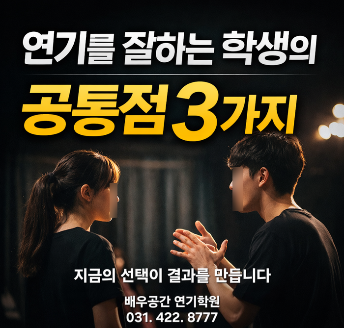 안녕하세요. 배우공간 연기학원입니다. 소수정예로 기본기부터 체계적인 커리큘럼을 통해 배우 훈련을 진행하고 있습니다. 열심히 하고 있는데도 변화가 느껴지지 않는다면 문제는 재능이 아닐 수 있습니다. 연기를 배우고 있는데 왜 늘지 않는 걸까요? 잘하고 있는 게 맞는지? 많은 학생들이 같은 고민을 합니다. 시간을 투자하고, 수업도 꾸준히 듣는데 생각만큼 변화가 느껴지지 않는 경우가 많습니다. 그 이유는 단순합니다. 문제는 ‘시간’이 아니라 ‘방식’입니다. 그리고 연기는 정답이 있는 예술이 아닙니다. 무엇인가 정답을 찾으려고 하면 자의식에 갇히게 됩니다. ⸻ 대부분의 연기 수업은 감정을 만들어내는 데 집중합니다. 하....... <img src="https://blogthumb.pstatic.net/MjAyNjA0MDNfNjcg/MDAxNzc1MjI1MTE2MjQ1.rONyKHqTVcdk_un5UQ2YiuGHw2Uc4RRhatLArjiXppcg.Z8nA99veVhB6f8wXsd5OYwvz6KN72VAyXylfjxLOXK8g.PNG/%BF%AC%B1%E2%B8%A6_%C0%DF%C7%CF%B4%C2_%C7%D0%BB%FD%C0%C7_%B0%F8%C5%EB%C1%A1_3%B0%A1%C1%F6%28%B9%E8%BF%EC%B0%F8%B0%A3%29.png?type=s3" />
