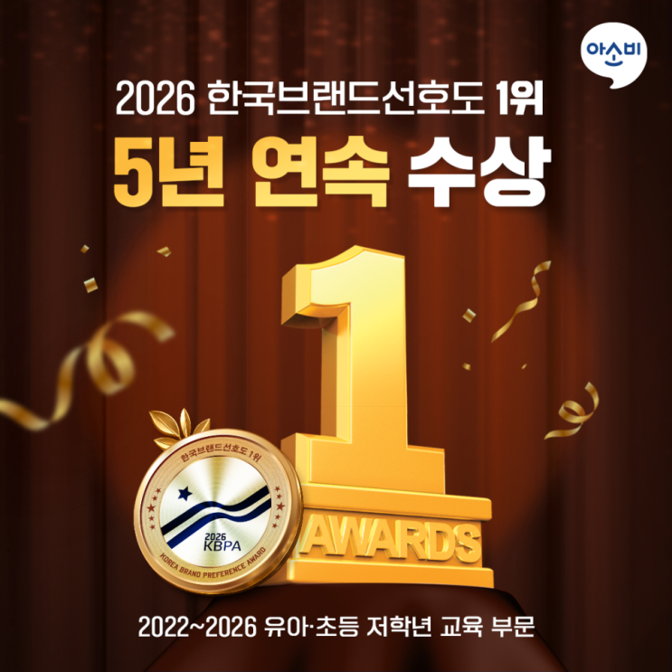 안녕하세요. “교육을 지킨다!” 유치~초2 전문 브랜드 아소비 안양 호계학원입니다. 아소비가 유아·초등 저학년 교육 부문에서 2026 한국브랜드선호도 1위에 선정되었다는 기쁜 소식 전해드려요! 그리고 무려 5년 연속 1위라는 성과까지 이어가게 되었답니다 이 상은 한경비즈니스가 주최하고 한국마케팅포럼이 주관하는 시상으로, 브랜드의 인지도뿐만 아니라 만족도, 전문성, 신뢰도 등을 종합적으로 평가해 선정하고 있어요. 단순한 인기투표가 아니라, 소비자의 신뢰를 기반으로 한 ‘지속 가능한 브랜드 가치’를 인정받았다는 점에서 더욱 의미가 있어요. 그렇다면 아소비가 꾸준히 선택받는 이유는 무엇일까요? 아이의 속도를....... <img src="https://blogthumb.pstatic.net/MjAyNjA0MDRfNzAg/MDAxNzc1MjgxNzY0MDQy.gfXKnd6iVi7vIOqVCSufBX1p6yGYmh3yYE0Q4yrnXLUg.8e6_3aqBgXC0tVEDzuVfGe9iciBRP6gQ8IdoZXOlAS4g.PNG/KBPA-%C1%A4%B9%E6%C7%FC_%282%29.png?type=s3" />