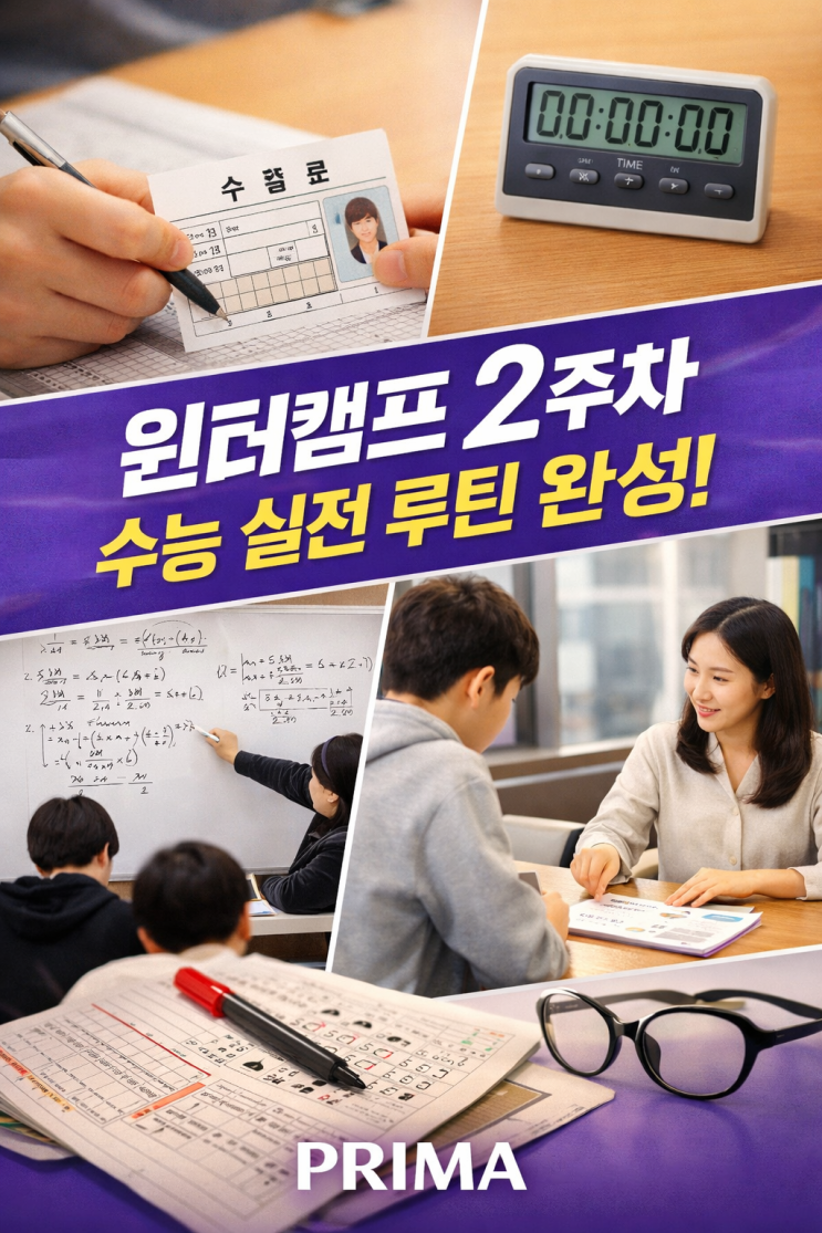 안녕하세요, 프리마 영어입니다 : ) 현재 한참 윈터캠프와 예비고 1학년, 2학년 학생들의 특강이 진행중인데요, 첫 주차때는 아이들이 정말-정-------말피곤해 하고 공부와 테스트를 보는데, 비몽사몽 했습니다. 윈터캠프 2주차, 수능 시간표 그대로 ‘실전 루틴’이 자리 잡기 시작했습니다 윈터캠프 2주차는 아이들이 본격적으로 수능의 구조와 리듬에 익숙해지기 시작한 시기였습니다. 수업, 관리, 모의수능, 상담까지 모든 과정이 실제 수능 하루 흐름에 맞춰 운영되고 있습니다. 1. 수능 시간표 기반 수업 운영 – 과목별 ‘실전형 구조’ 국어 : 독서 + 선택과목(언매/화작) 전 영역 훈련 문학 2 지문 독서 2 지문 선택과목(언어와 매....... <img src="https://blogthumb.pstatic.net/MjAyNjAxMjdfNDUg/MDAxNzY5NDQwMDEyNzE4.YUgN_8pFPfBAtgjq1Lk8rRSgjhQB3mxAbb-jBzzke68g.tFxeU3vuxslaN4CZ3yqeng9cOEzxV9SNU4izpwiI4lEg.PNG/ChatGPT_Image_2026%B3%E2_1%BF%F9_26%C0%CF_%BF%C0%C8%C4_11_52_21.png?type=s3" />