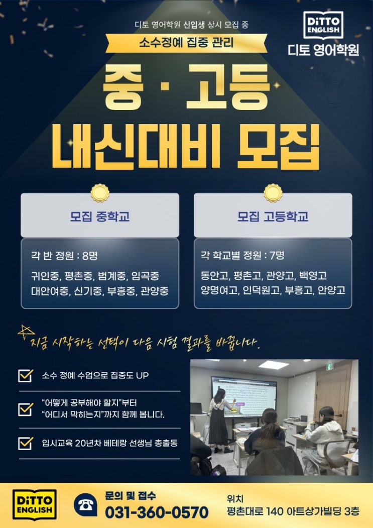 안녕하세요,평촌학원가 [고효율 소수정예·정밀관리] 디토영어학원입니다. 내신 모집 안내드립니다. “왜 우리 아이는 점수가 오르지 않을까요?” 문제는 ‘양’이 아니라 잘못된 공부 방법입니다. 많이 풀어도, 틀리는 이유를 모르면 성적은 그대로입니다... 단순 수업이 아니라, 아이의 공부 습관 자체를 바꿉니다. 그래서 결과가 달라집니다. 정원 제한 운영 (중등 8명 / 고등 7명) 위치: 평촌대로 140 아트상가빌딩 3층 301호 상담 문의: 031-360-0570 상담 가능 시간: 평일 오후 2시 ~ 10시 ⩗ 수업이 끝나면 바로 학습 결과 문자를 보내 부모님께 학습 흐름을 투명하게 공유하고, ⩗ 학생에 따라 필요한....... <img src="https://blogthumb.pstatic.net/MjAyNjAzMjNfMTQz/MDAxNzc0MjY3Njk5NjIy.Oif2A4x233uW0zJ1QxxzmZkeGjYbw3YcziAziuPNFlwg.Tki7huUvwiaHhbpBSAur4Y4nmERrUjwryD_xZW_lOzIg.JPEG/%C1%DF%B0%ED%B5%EE_%B3%BB%BD%C5%B8%F0%C1%FD.jpg?type=s3" />