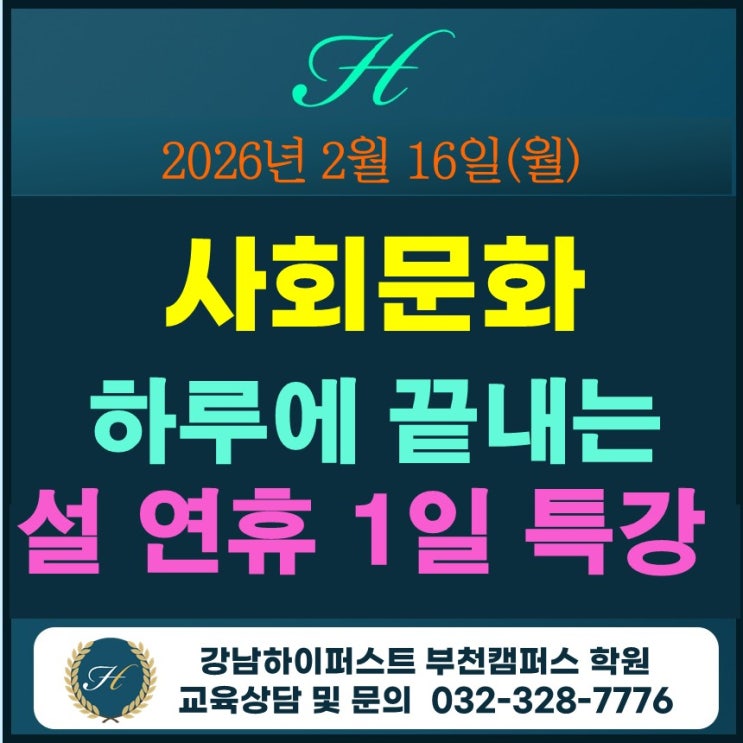 안녕하세요~ 강남하이퍼스트 부천캠퍼스 원장 이정아입니다. 다가오는 설 연휴, 누군가에게는 휴식의 시간이지만, 수능 1등급을 꿈꾸는 수험생에게는 전략적인 승부처가 되어야 합니다. 특히 사회문화는 개념의 흐름을 한 번에 잡느냐, 파편화된 지식으로 남겨두느냐에 따라 성패가 갈리는 과목입니다. 단 하루, 단 한번의 강의로 사회문화 전 과정을 마스터하고 1등급의 확신을 가질 수 있는 설 연휴 사회문화 끝장 특강을 준비했습니다. 사회문화, 수능대비 하루에 끝내는 "끝장 1일 특강" ! 1. 과목 : 사회문화 2. 대상 : 고3 및 N수생 3. 일시 : 2026년 2/16(월) 10시 ~19시30분 점심시간 30분 포함(식사 제공) 4. 강의 목표 : 사....... <img src="https://blogthumb.pstatic.net/MjAyNjAxMTdfMjQ4/MDAxNzY4NjIzODYyNTkx.qCcD30G7vXDCA3umXTFD356djfoNegy_PL50nX-ipYYg.tTLKd86q2m8nh-P3Q7RFLfmDa0bI_E5haty2t3NRKqEg.JPEG/1%C0%CF%C6%AF%B0%AD%BB%E7%C8%B8%B9%AE%C8%AD.jpg?type=s3" />