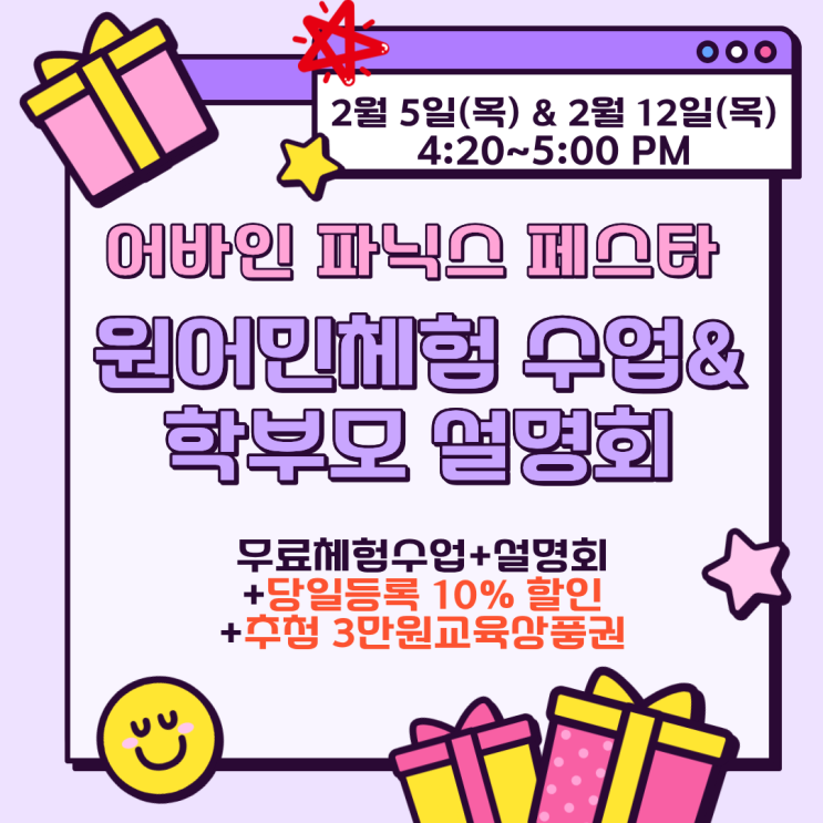 안녕하세요! 부천 상동의 영어 자부심, 어바인어학원입니다. 어느덧 겨울방학의 절반을 향해 가고 있습니다. 2월이 지나면 곧 설레는 3월 새 학기가 다가오겠죠?^^ 현재 어바인어학원에서는 아이들이 각자의 스케줄과 속도에 맞춰 주 1회~3회까지 자유롭게 수강하는 '프리 파닉스(Pre-Phonics)' 수업이 한창 즐겁게 진행되고 있는데요! 아이들이 영어를 공부가 아닌 '언어'로 자연스럽게 받아들이는 모습을 보며, 더 많은 친구에게 이 즐거움을 나눠주고 싶다는 생각이 들었습니다. 그래서 준비했습니다! 단순한 설명회가 아닙니다. 아이와 학부모님이 함께 즐기는 영어 축제! 2026 어바인 파닉스 페스타 ?....... <img src="https://blogthumb.pstatic.net/MjAyNjAxMTlfMTcw/MDAxNzY4Nzk3Nzk2Mzc0.8-DKcD3yrG0JOr0aoVXte-Oze9iSIY0m1-ToGszhny8g.qOdDEE7HzQbBz3B2ZVJQ8Gqt6_lhdxs5xf7qAxmQae4g.PNG/%C1%A6%B8%F1%C0%BB_%C0%D4%B7%C2%C7%D8%C1%D6%BC%BC%BF%E4._%281%29.png?type=s3" />