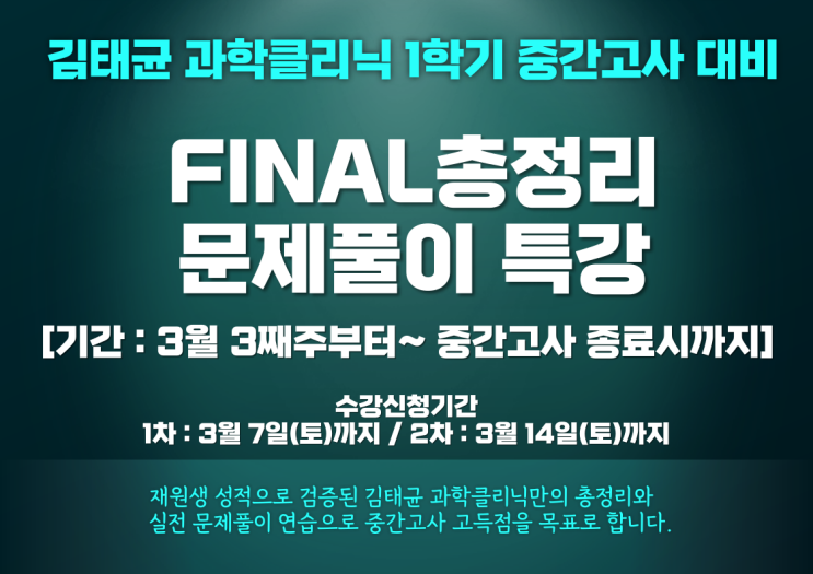 [ 김태균과학클리닉 중간고사대비 FINAL총정리 + 문제풀이 특강 ] ※ 김태균 과학클리닉에서는 과학 학교별 중간고사범위 6주 총정리와 문제풀이 특강을 진행합니다.※ ◎ 내용 : 중간고사범위 총정리와 실전문제풀이 특강 6주+직전대비 ◎ 기간 : 3월 3째주부터~중간고사 종료시까지 ★재원생 성적으로 검증된 김태균 과학클리닉만의 총정리와 실전 문제풀이 연습으로 중간고사 고득점을 목표로 합니다.★ - 수강신청 기간 - 1차: 3월 7일(토)까지 2차: 3월 14일(토)까지 수강을 원하는 학생은 학원 또는 담당선생님께 말씀해주시기 바랍니다. (정원제로 인해 선착순으로 진행하며 정원마감시 모집은 종료됩니다.) 김태균수학/과학클리닉 |김나....... <img src="https://blogthumb.pstatic.net/MjAyNjAzMDVfMzAw/MDAxNzcyNzAwOTg5MTE4.f0fJiCEQ7wNtAOv2kulONSRg7afrv_K51y6FaFhzEc4g._6CJaxeowCcKMVwzdtu80-AURql1rdfLxrCQ-gJpA0Eg.PNG/%B0%FA%C7%D0%C5%AC%B8%AE%B4%D0_%C1%DF%B0%A3%B0%ED%BB%E7%B4%EB%BA%F1_final%C6%AF%B0%AD.png?type=s3" />