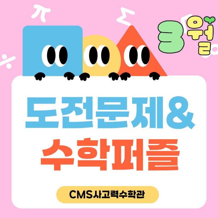 안녕하세요 CMS 사고력수학관 부천지점입니다. 3월, 도전하는 힘차게 출발해보아요! 3월 도전문제 및 수학퍼즐 문제지를 공유드립니다. 스스로 생각하고 끝까지 해결해보는 과정이 아이들의 사고력을 한층 더 성장시켜 줄 거예요. 도전문제 우수자에게는 상장 ️도 수여하오니 많은 관심과 적극적인 도전 부탁드립니다. 학원등록 번호 : 5532호 교습비 안내 <img src="https://blogthumb.pstatic.net/MjAyNjAzMDVfNjIg/MDAxNzcyNzAxMTk0MjEx.ItTcy9oasrxCsUy2CHbr1M3NgET6Rcf2GXaGYhP7RQUg.CfjdCmndrDEFeQfchvGoLNmEvghx7QP5xcf1G_wYv3Eg.JPEG/%B5%B5%C0%FC%B9%AE%C1%A6%BC%F6%C7%D0%C6%DB%C1%F1_%281%29.jpg?type=s3" />