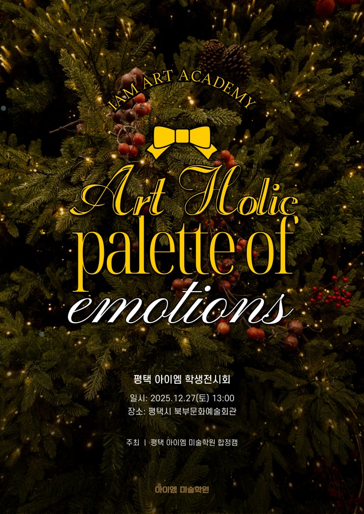 안녕하세요~! 평택 아이엠 미술학원 아트홀릭 전시회 소식 입니다~ 지난 12월 27일, 평택 북부문예회관에서 학생들의 그림 전시회를 진행했습니다. 초·중등부부터 고등부까지, 그동안 아이엠에서 차곡차곡 쌓아온 아이들의 노력과 성장이 한자리에 모인 뜻깊은 시간이었습니다~ 아이엠 미술학원의 전시장 분위기와 작품들을 미리볼 수 있는 영상!! 완전 기대되지 않나요! 귀여운 학생들과 전시포스터~! 그동아 열심히 그려온 그림들이 전시되는 날이라 학생들 모두 한껏 설렘 가득한 모습이었답니다! 전시장은 겨울 시즌에 맞춰 크리스마스 분위기의 포토존으로 꾸며졌습니다. 작품 감상 후 아이들과 함께 사진을 남기며 전시의 추억을 기록하는....... <img src="https://blogthumb.pstatic.net/MjAyNjAxMDlfMTIg/MDAxNzY3OTM0MDkyMjg3.Cn7ym6giFaDBCE4vEUCAvrK68tVm8Q7driDMgQUR_YYg.Ghpn7wGS82LW6EpQ-JvD_PzH8FcOR7yf7qTTk101Rp8g.JPEG/KakaoTalk_20260109_133727382.jpg?type=s3" />
