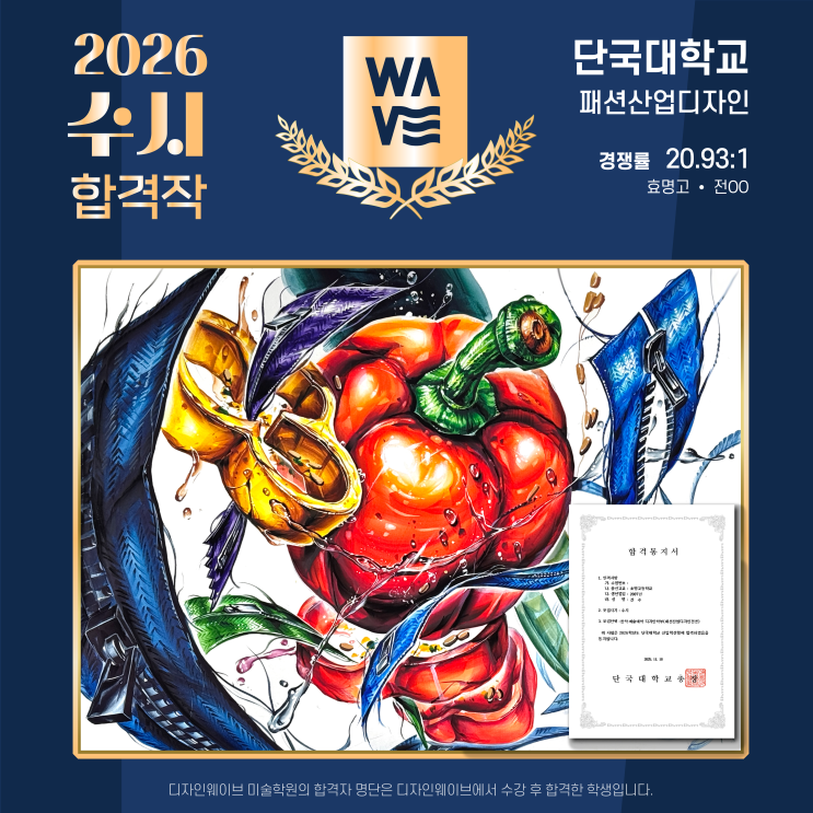평택미술학원 · 송탄미술학원 입시전문 미술학원 디자인웨이브 미술학원 경기도 평택시 경기대로 1371, 경성빌딩 3F (송탄출장소 맞은편) 031.665.4970 안녕하세요~! 평택 송탄 입시전문 미술학원 디자인웨이브 미술학원입니다 '◡' 2026학년도 입시가 모두 종료되었습니다. 오늘은 정시 마지막 발표 일이며 이제 예비번호를 부여받은 학생들의 추가합격 발표만을 남겨두었습니다. 수험생 여러분과 학부모님 및 모든 선생님들 정말 수고 많으셨습니다 (_ _;) 이번 포스팅은 그간 바쁜 정시 일정 속에 미쳐 올리지 못한 수시 합격생 재현작을 공개하려 합니다~~ 먼저 20.93:1 경쟁률을 뚫고 최초 합격을 한 전○○ 학생의 단국대(죽전) ....... <img src="https://blogthumb.pstatic.net/MjAyNjAyMDJfMjgx/MDAxNzcwMDE4MTgwNjg1.3c9BxBVRtUlEWlNnSsjvuiLughNr2eqvnmCoERK-CM8g.cpCIuD3va1RDAmsboqpnq-W7icg4ZwZSaLHkFzegPlwg.PNG/2026%BC%F6%BD%C3%C7%D5%B0%DD%C0%DB-05.png?type=s3" />