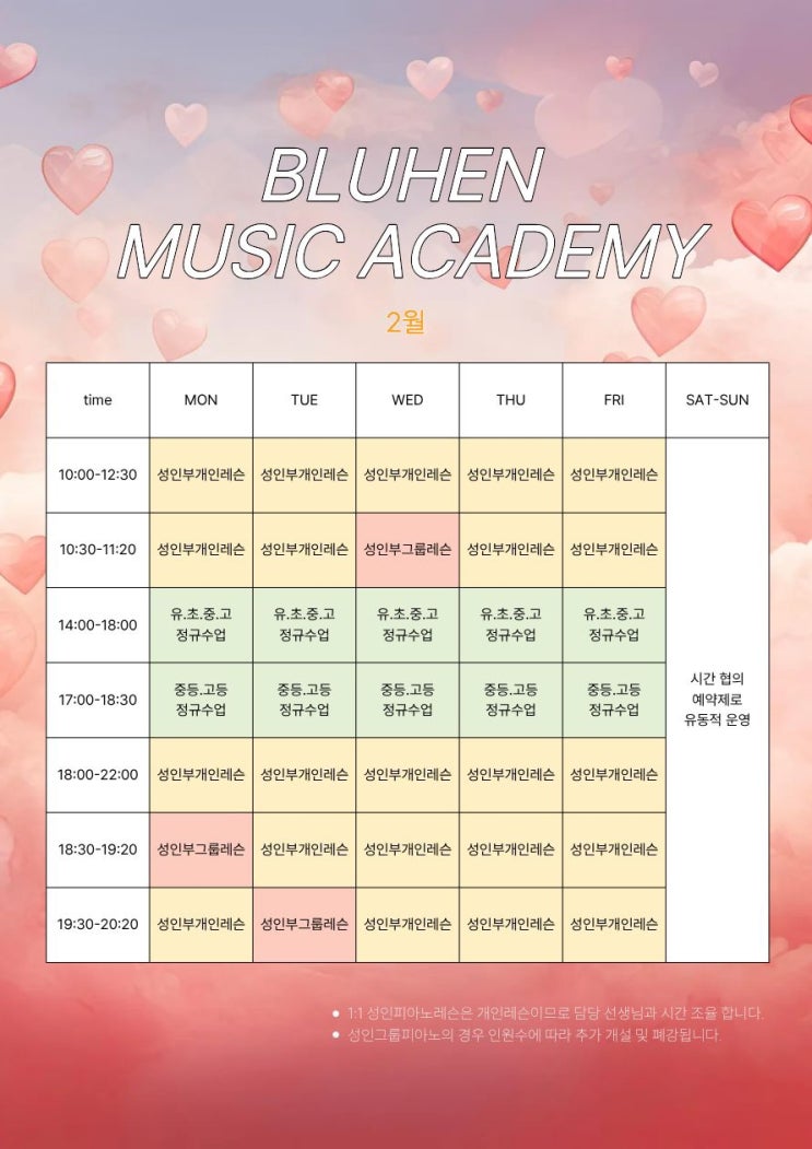 2월 블루헨 시간표 안내 아이부터 성인까지, 각자의 속도에 맞춰 배우는 피아노 공간입니다. ☀️ 오전 · 저녁 성인 레슨 유·초·중·고 정규수업 성인 그룹레슨 / 1:1 개인레슨 선택 가능 “취미로 시작했는데, 어느새 피아노 치는 시간이 제일 기다려져요.” 요즘 가장 많이 듣는 말이에요 시간표 보시고 편한 시간 DM 또는 카톡 주세요 한 분 한 분 맞춰 상담 도와드릴게요. 블루헨음악학원 #평택피아노 #동삭동피아노 #성인피아노 #취미피아노 #블루헨음악학원 <img src="https://blogthumb.pstatic.net/MjAyNjAyMDJfNjEg/MDAxNzcwMDEyMDU0MTY4.f72HCyZTgLcQFWnWrMK8pOneCsNDnnjOsI0_2T1NTScg.zkVZXuEu3qIW8KBpuLwCj6J1yech2rPn4dvW0U1IuNcg.JPEG/IMG%A3%DF1492.JPG?type=s3" />