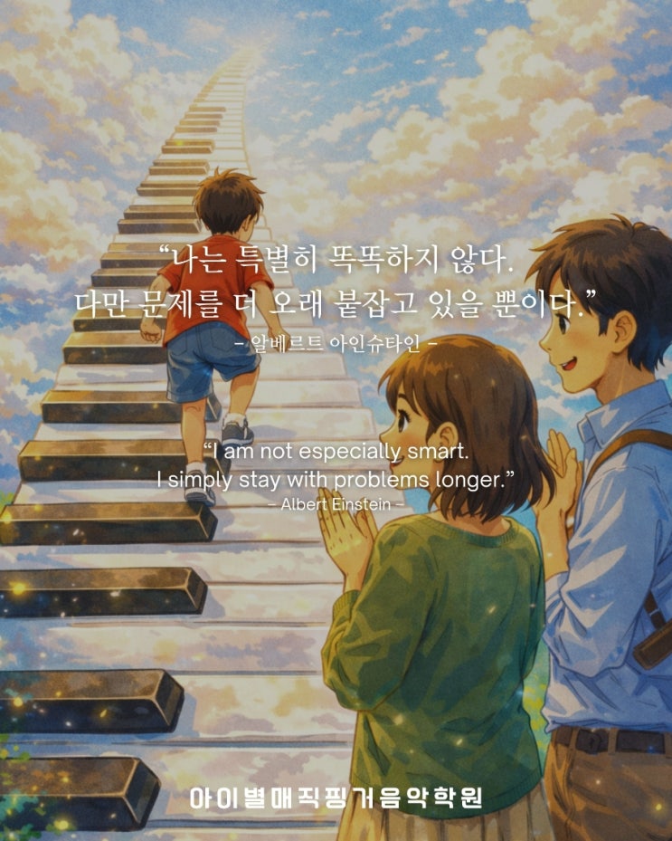 아이를 키우다 보면 우리는 자주 속도를 기준으로 아이를 바라봅니다. 누가 더 빨리 읽는지, 누가 먼저 이해하는지, 누가 더 앞서 나가는지. 그래서 아이가 조금 느려 보이면 부모는 불안해집니다. "혹시 뒤처지는 건 아닐까?" "재능이 없는 건 아닐까?" 하지만 인류 역사상 가장 위대한 과학자 중 한 명인 알베르트 아인슈타인은 이렇게 말했습니다. "나는 특별히 똑똑하지 않다. 다만 문제를 더 오래 붙잡고 있을 뿐이다." ❗️이 말은 교육에서 아주 중요한 사실을 알려줍니다. 실력을 만드는 것은 순간적인 이해력이나 타고난 재능이 아니라, '붙잡고 있는 힘'이라는 것입니다. 아이의 성장은....... <img src="https://blogthumb.pstatic.net/MjAyNjAyMDNfNTcg/MDAxNzcwMTE4MzQ2NzQ0.ckAXKHE5DkoBaoag7t2YTeAeLnmuT7p85CJc2n4w7Aog.rUQM1t630jOzij-lhS1istv8MGaNZQ4OIMJU6eXNRFgg.JPEG/900%A3%DF1770118102580.jpg?type=s3" />
