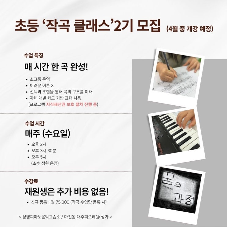 [ 초등 ‘작곡’ 2기 모집 ] 이론 중심 수업이 아닌 선택과 조합으로 배우는 창작 작곡 수업 수업은 소그룹 형태로 운영되며, 아이들이 서로의 아이디어를 나누고 매 수업시간마다 한 곡을 완성합니다. 본 수업은 자체 개발한 카드 기반 작곡 교재로 운영됩니다. (현재 지식재산권 보호 절차 진행 중입니다.) ▶ 수업 시간 (수요일) 2:00 3:30 5:00 ※ 소수 정원 운영 ▶ 대상 초등학생 (1학년~6학년) ▶ 수강료 재원생 : 추가 비용 없음 신규 등록 : 월 75,000원 ♬ 이런 아이에게 추천합니다 ✔ 음악을 좋아하지만 작곡은 처음인 아이 ✔ 자기 생각을 음악으로 표현해보고 싶은 아이 ✔ 한 곡을 끝까지 완성해보는 경험이 필요한 아이 ✔ 새로....... <img src="https://blogthumb.pstatic.net/MjAyNjAzMDNfMTU0/MDAxNzcyNTIwODc2Njg0.3kjLd15PE_VVrvSmTQ3496lH65CazGBY6hLvOoWG_R0g.IC548vHJdnMPa6sYmyI9Gx7PLeEryntvNb7xAMFAlj4g.JPEG/2026_%C0%DB%B0%EE%C5%AC%B7%A1%BD%BA_%C8%AB%BA%B8%B9%B0.jpg?type=s3" />