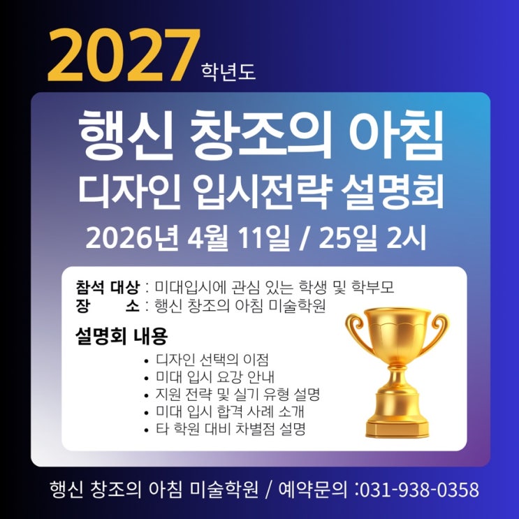 안녕하세요~ 행신 창조의아침 미술학원입니다. 벌써 2026년도 4월이 되었네요, 시간이 너무 빠르네요, 2027학년도 미대 입시, 지금이 시작입니다 미대 입시는 타이밍이 전부입니다. 늦게 시작하면 따라가기 힘들고, 제대로 시작하면 결과가 완전히 달라집니다. 그래서 준비했습니다. 2027학년도 대비 디자인 입시전략 설명회 ⸻ 설명회 일정 ✔ 2026년 4월 11일 / 25일 (토) 오후 2시 ✔ 장소 : 행신 창조의 아침 미술학원 ✔ 대상 : 미대 입시에 관심 있는 학생 & 학부모님 누구나 ⸻ 이번 설명회, 뭐가 다르냐면요 단순한 정보 전달 아닙니다. “합격하는 방법”만 정확하게 알려드립니다. ✔ 디자인 선택 시 유리한 이유 ✔ 2027학년도 미....... <img src="https://blogthumb.pstatic.net/MjAyNjA0MDFfODcg/MDAxNzc1MDM3Njg5OTk0.5E3sZ68_jPO_PTmqIaX1W1ZwCO6IaXP7g9_Z2iCvOYog.L4CpM6RXog1jGYhO_HPYnXEddt43HADsUkf9ZIjwPyUg.JPEG/IMG%A3%DF3052.jpg?type=s3" />