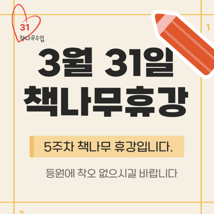 [책나무 휴원 안내] 3월 31일은 수업이 없습니다. 안녕하세요. 학원 운영 일정에 따라 3월 31일은 5주차 휴원일로 수업이 진행되지 않습니다. 착오 없으시길 부탁드립니다 아이들은 이번 기회에 읽고 싶었던 책을 천천히 읽어보는 시간도 가져보면 좋겠습니다 4월 수업에서 더욱 알찬 독서 활동으로 만나겠습니다. 감사합니다 신규입학생을 위한 문해력 진단테스트 신청 <img src="https://blogthumb.pstatic.net/MjAyNjAzMjlfMTk0/MDAxNzc0NzkwMzM3NzQ3.UtFLq6kptvDwzVW9pSlK0MbAPLJ8_OUUYdvKMmSpZTcg.Kl6W9V2q2awgXaYaVAbd9r0BlGcgeVwyEKCV5y95aKAg.PNG/900%A3%DF1774790167046.png?type=s3" />