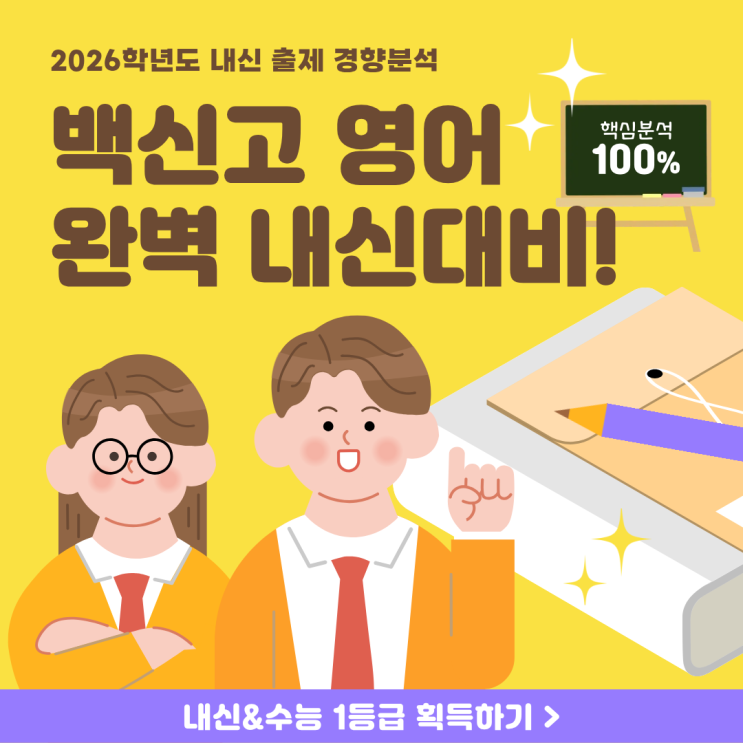 안녕하세요! 일산 백마학원가 학교별 내신영어 강자, 구루쌤의 내공영어입니다. 고등학교에 첫발을 내딛은 고1 학생들과 학부모님들, 모두 반갑습니다! 새로운 환경과 학업에 대한 기대감도 크지만, 곧 다가올 첫 내신 시험에 대한 걱정도 많으시죠? 백신고 전문학원 구루쌤의 내공영어 하지만 구루영어와 함께라면 걱정 NO!! 백신고는 저희 학원의 주요 대비 학교 중 하나로, 매년 높은 정확도의 출제 예측과 철저한 학습 관리로 학생들의 성적 향상을 돕고 있습니다. 저희 구루쌤의 내공영어는 백마학원가에서 수년간 백신고 학생들을 지도해오면서 많은 내신데이터 및 입시정보가 쌓였기 때문에, 백신고 내신에 있어서 특히 자신 있답니....... <img src="https://blogthumb.pstatic.net/MjAyNjA0MDFfMTMw/MDAxNzc1MDQ3OTMyMTgy.GvcNCwgB25eYn0Ue9YQVU9BTixinTlM5toD4hI-I5vsg.wjkIHYjomeffVA9ULbxIci_thQJoV72QDELmHCUlGFQg.PNG/%B9%E9%BD%C5%B0%ED1%C1%DF%B0%A3.png?type=s3" />