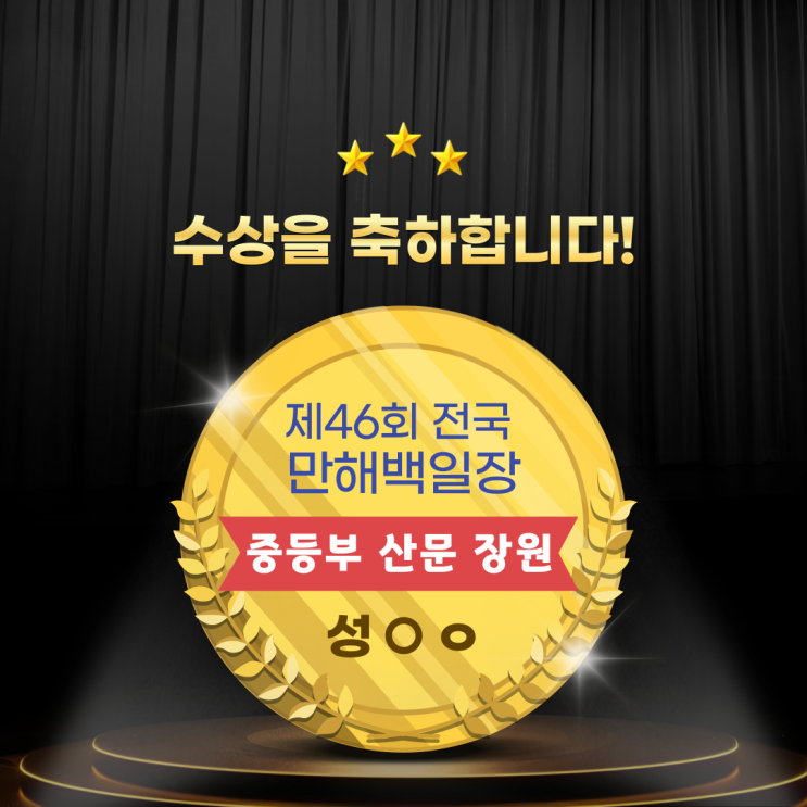 안녕하세요. 일산 글탑문예창작입니다. 제46회 전국 만해백일장에서 글탑의 성0ㅇ 학생이 중등부 산문 장원을 수상하였습니다. 축하합니다! ^^ 성0ㅇ 학생의 성실함과 소설적 재능이 전국대회에서 인정받은 쾌거입니다. 앞으로 학생의 글쓰기가 더욱 발전하여 보다 많은 성취를 이룰 수 있도록 글탑문예창작이 학생과 함께 최선을 다하겠습니다. <img src="https://blogthumb.pstatic.net/MjAyNjA0MDJfMTU1/MDAxNzc1MTE3NjA0MDkx.xi222-GgaXwxVREvJ1DJfyVF6pVFCJl-O9u5HDdPOeYg.6Ghgur68shSuPzy8oxn0mgioIfgDWUQ0iOpRjFifDJkg.PNG/%B4%EB%B9%AE2-001_%281%29.png?type=s3" />