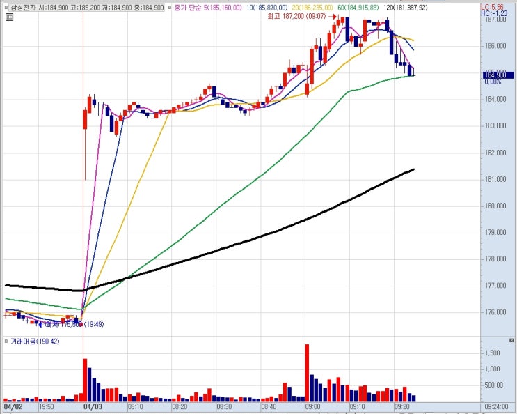 3월 시장은 정말 만만치 않았습니다. 4월도 만만치 않을 것 같습니다. 어제 트럼프의 연설로 전쟁 위기는 더 커진 듯 하고요. 어제 야간선물의 급등으로 현재 삼성전자 주가는 상증 중이기는 합니다. 하지만, 3월부터 이어지는 변동성 장세는 여전합니다. 조금 있으면 잠깐 올랐던 삼성전자 주가는 다시 내리겠죠. 개인적으로 코스피 지수가 5000을 한 번 깨야 할 것 같다고 생각하고 있습니다. 변동성이 심한 장세에서는 항상 사람들의 예상을 깨면서 움직입니다. 5000 포인트에 오면 매수해야 한다고 생각하는 사람들이 많은 것 같은데요. 이런 투자자들의 기대감을 실망으로 전환시켜주는 어떤 계기가 있지 않을까 하네요. 그렇다면 삼성전자....... <img src="https://blogthumb.pstatic.net/MjAyNjA0MDNfMjE2/MDAxNzc1MTc1ODg1Mzcz.SnokPj8EI-FYisXUrpqRXhxV9INVoz62bh7eEMSVM3Qg.joflYYglMBPioiEmd5ZxBjvyUPza2ltM-5h1zcXb3vsg.JPEG/20260403_092430.jpg?type=s3" />