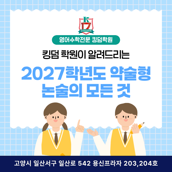 안녕하세요! Nothing is Impossible to We ( Engilsh & Math) 믿고 보낼 수 있는 학원! 내신대비와 수능 성적의 향상을 기대할 수 있는 학원! 고양시 일산동 후곡학원가에 위치한 고등부 입시/ 내신 영어, 수학 전문 킹덤 학원입니다. 내신 성적이 4등급대 이하로 내려가면 많은 학생과 학부모님께서 인서울이나 수도권 대학 진학을 포기하곤 하시지요. 하지만 아직 포기하기에는 이릅니다! 전략만 잘 세운다면 충분히 승산이 있는 전형이 바로 '약술형 논술'이기 때문입니다. 오늘은 2027학년도 약술형 논술의 변화와 함께, 킹덤 학원에서 어떻게 합격 전략을 세우고 있는지 상세히 안내해 드릴게요. 2027학년도 약술형 논술, 선....... <img src="https://blogthumb.pstatic.net/MjAyNjAzMjZfNCAg/MDAxNzc0NTE1ODk2NzEz.Jp9jhpti3PMx0vDzT9i3vhtbKq5LZHr8LC1T4b19Ch4g.vaKqMwXq6tJcgUCTmoUPf6jQ9jLhSHoUcirtqa6fLPwg.PNG/1.png?type=s3" />