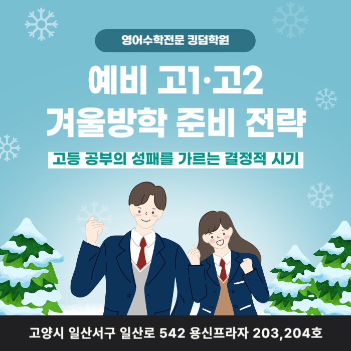 안녕하세요! Nothing is Impossible to We ( Engilsh & Math) 믿고 보낼 수 있는 학원! 내신대비와 수능 성적의 향상을 기대할 수 있는 학원! 고양시 일산동 후곡학원가에 위치한 고등부 입시/ 내신 영어, 수학 전문 킹덤 학원입니다. 겨울방학은 단순히 쉬거나 선행을 하는 기간이 아닙니다. 특히 예비 고1과 고2에게 겨울방학은 고등학교 학습의 방향과 기준을 정하는 중요한 전환점입니다. 이 시기를 어떻게 보내느냐에 따라 학기 중 공부 난이도 체감과 성적 안정성이 크게 달라집니다. 중요한 것은 얼마나 했는가가 아니라 ‘어떤 방식으로 준비했는가’입니다. 예비 고1·고2 겨울방학에 반드시 점검해야 할 학습 포인트를 차분히 정리....... <img src="https://blogthumb.pstatic.net/MjAyNjAxMDlfMTA3/MDAxNzY3OTI5ODg3NjIw.WBXzouAwS4_0b0zzLohOhHdRMXD15EgKy77_W8-8HHIg.rZ_9nJVu2TpAQZzbMa-Wgh9iizlwWqD2SSeY23V-Gjcg.JPEG/%C0%CF%BB%EA%B0%ED_%C0%CF%BB%EA%B4%EB%C1%F8%B0%ED_%C0%FA%B5%BF%B0%ED_%C1%D6%BF%B1%B0%ED_%B0%A1%C1%C2%B0%ED_%B4%EB%C8%AD%B0%ED_%281%29.jpg?type=s3" />