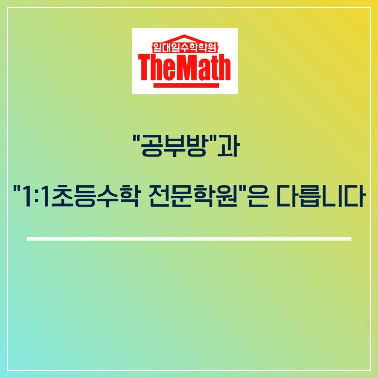저도 많이 질문을 받고 어머님들도 많이 고민을 하시는 부분이라고 생각합니다. 과외는 단기적으로 하는 경우들이 많기 때문에 보통 학원과 공부방중에서 선택을 하시는데 오늘은 그 둘의 차이를 알아보려고 합니다. 공부방은 "우리 아이의 속도에 맞춰주는 곳" 1:1 초등수학 전문학원은 " 우리 아이의 한계를 끌어올려 결과를 만들어내는 곳"입니다 "1:1 초등수학 전문학원"과 "공부방"은 운영방식, 커리큘럼, 학생 관리에서 뚜렷한 차이가 있습니다. * 1:1 초등수학 전문학원 학생의 수준, 성격, 학습 패턴에 맞게 진도와 방법을 조정하여 맞춤형 수업을 합니다. 성적 향상을 위한 전략적 시스템으로....... <img src="https://blogthumb.pstatic.net/MjAyNjAxMTdfMTI3/MDAxNzY4NjExNTE0Nzk5.N6l6pf7qfsOG_ldYZo03i6-DXf5F7vHy7tkvY4RRbisg.SwLqzBIg9kRyOIRZeJoI8AchbtWx5bdWsgLpExibtaMg.JPEG/%C3%CA%B5%EE%BC%F6%C7%D01.jpg?type=s3" />