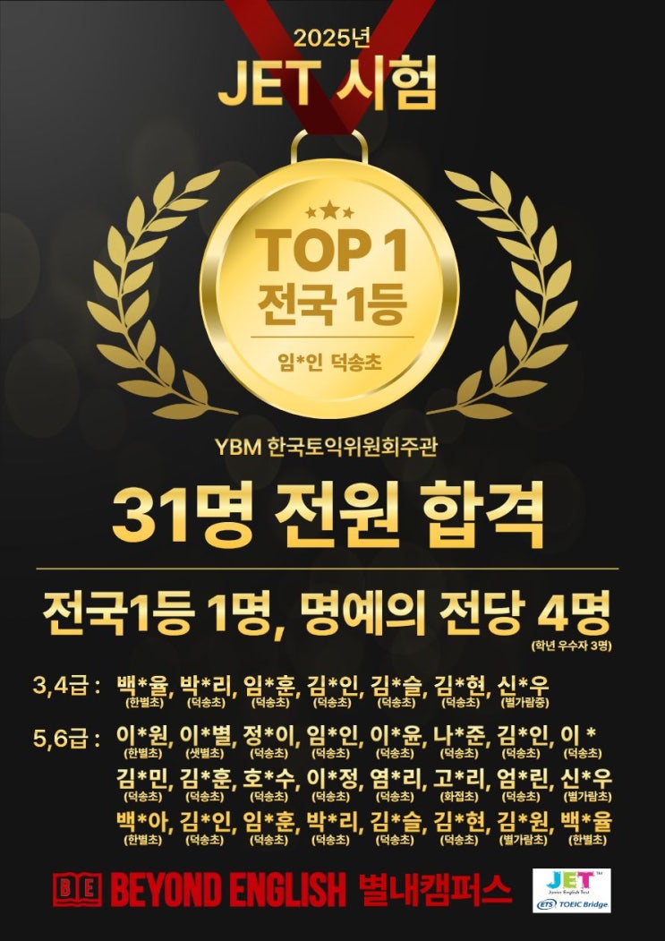 안녕하십니까! 품격이 다른 별내동 영어학원 비욘드 잉글리쉬입니다. 지난 2025년 11월 JET 시험에서 우리 별내캠퍼스 학생들이 전원 합격하는 놀라운 성과를 냈어요! 더 감동적인 건… 전국 명예의 전당에 오른 만점자도 있다는 사실! 외부에서 시험을 보는 경험은 앞으로의 무수한 시험에서 좋은 경험이 될 것입니다. 처음 시험 응시하는 친구들은 초급으로, 초급 합격한 친구들은 중급으로 시험을 봅니다 왜 영어는 비욘드잉글리쉬로 시작해야할까요? 1. 체계적인 커리큘럼 비욘드잉글리쉬의 커리큘럼은 대한민국 특허청으로부터 특허받은 교재로 듣기, 말하기, 읽기, 쓰기 능력을 균형 있게 길러줄 수 있도록 단계별로 설계되어 있....... <img src="https://blogthumb.pstatic.net/MjAyNjAxMTNfMTcy/MDAxNzY4MjYwOTc5ODMy.b-tdEnCtELt2ppFcdYEmyJHIqZB4qFP4ZCSVhqij-RIg.4MsIBP2CFG9pgyPuMnt-xGmsZp1EU59IBq8MvWCt294g.JPEG/1764590980124.jpg?type=s3" />