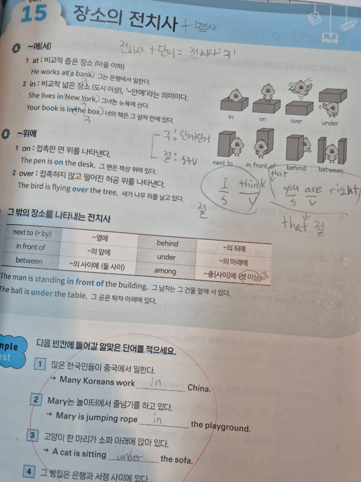 안녕하세요.^^ 오늘은 예비 중 1반. 중1 문법을 한창 하고 있는 반의 영작문 수업 책을 가지고 왔습니다. 오늘은 전치사 부분을 배웠네요. 전치사 뒤에는 명사가 오는 것을 문법 시간에 했지만, 다시 복습했고요. 전치사 뒤에는 명사뿐만 아니라, 명사구가 오는 것도 다시 파악합니다. 이때!! 구와 절이 헷갈려 다시 한 번 더 정리하였어요. 잊어버리는 것은 당연해요. 반복해서 숙지하는 것이 중요하죠. 모르면 또 필기하고, 모르면 또 정리하고, 그러면서 자연스럽게 내 것이 되겠죠? 전치사의 이론을 다시 한번 복습하고, 한국어로 된 문장을 영어로 영작해 보는 시간입니다. 옆 next to 뒤 behind 좁은 장소(~에) at 넓은 장소(~에) in 위 on....... <img src="https://blogthumb.pstatic.net/MjAyNjAzMDRfMjQx/MDAxNzcyNjEyMDA2NTA0.eibc8D9AmMviq27nASD6AvL2XHckNRJr8xSVUbCFZjsg.Ls3YCYnWF1yPq8upgiyayQQf9O1l3IyXh60yXMeCD0Ig.JPEG/900%A3%DFse%A3%DFone%A3%DF20260304%A3%DF171311%A3%DFa.jpg?type=s3" />