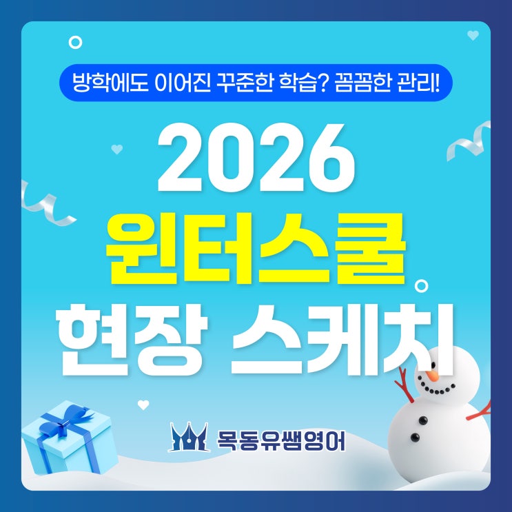 몇 달간의 겨울방학.. 말만 들어도 달콤한 시간이지만, 오히려 우리 학생들은 공부 리듬과 감각을 잃기 쉬운 때이기도 합니다 특히나 영어는 조금만 흐트러져도 어휘 / 독해 감각이 금방 무뎌지죠 방학처럼 수업이 없는 날이 많아질수록 결국 자습에서 갈리기 마련인데요?! 그래서 목동유쌤은 2026년 윈터스쿨로 아이들의 자습이 흔들리지 않도록 관리 방향을 세우고 점검했답니다! 오는 2월 27일을 기준으로 종강하게 된 모든 윈터스쿨! 이번 포스팅에서는 아이들이 이번 겨울을 얼마나 알차게 보냈는지 그 현장의 이야기를 여러분에게 전해드리고자 합니다 : ) 1:1 멘토 배정 상담 코칭 이번 윈터스쿨에서 목동유쌤이 가장 중요하게 운영했던 부....... <img src="https://blogthumb.pstatic.net/MjAyNjAyMjdfMTQ3/MDAxNzcyMTg0MTU4MzY5.WBxMVtTbLa0s1J7i3otCbUmBPxZgn5xV0NxepysFSzQg.jddAh8UJvyWr4hRmiMJ-AbRA0FD8XPO3hUjbXFa41DUg.JPEG/260227_%B8%F1%B5%BF%C0%AF%BD%DC_%BD%E6%B3%D7%C0%CF_%C0%A9%C5%CD%BD%BA%C4%F0_%C7%F6%C0%E5%BD%BA%C4%C9%C4%A1.jpg?type=s3" />