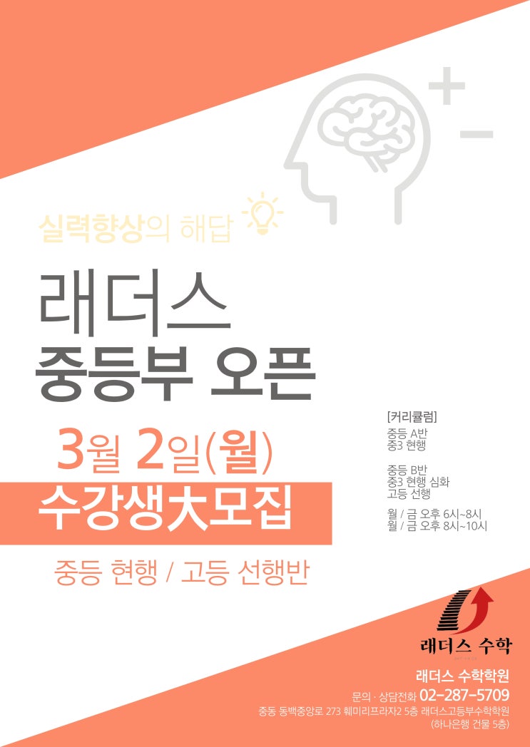 안녕하세요 래더스 수학학원입니다. :) 3월 2일 (월요일)부터 중3 학생들 대상으로 중등부를 공식 오픈합니다. 중등부는 A, B반으로 나뉘어질 예정이며 A반의 경우에는 현행 수학을, B반의 경우에는 선행 수학을 진행합니다. 고등부를 제대로 가르치는 학원, 래더스학원에서 수학의 사다리를 만들어보세요. 감사합니다. 상담문의: 031-287-5709 <img src="https://blogthumb.pstatic.net/MjAyNjAxMjlfMjYy/MDAxNzY5NjY1OTc1Mzcy.1DAjbe5Z1M-VP-tt3DIWIXxLM8Ur1jC9ZsNhmnjNDv0g.yCsxcQSAVECFxVfGmpoM8OURfGROpy4u8x2jxPVHGHkg.JPEG/제목을-입력해주세요_-page-00001.jpg?type=s3" />