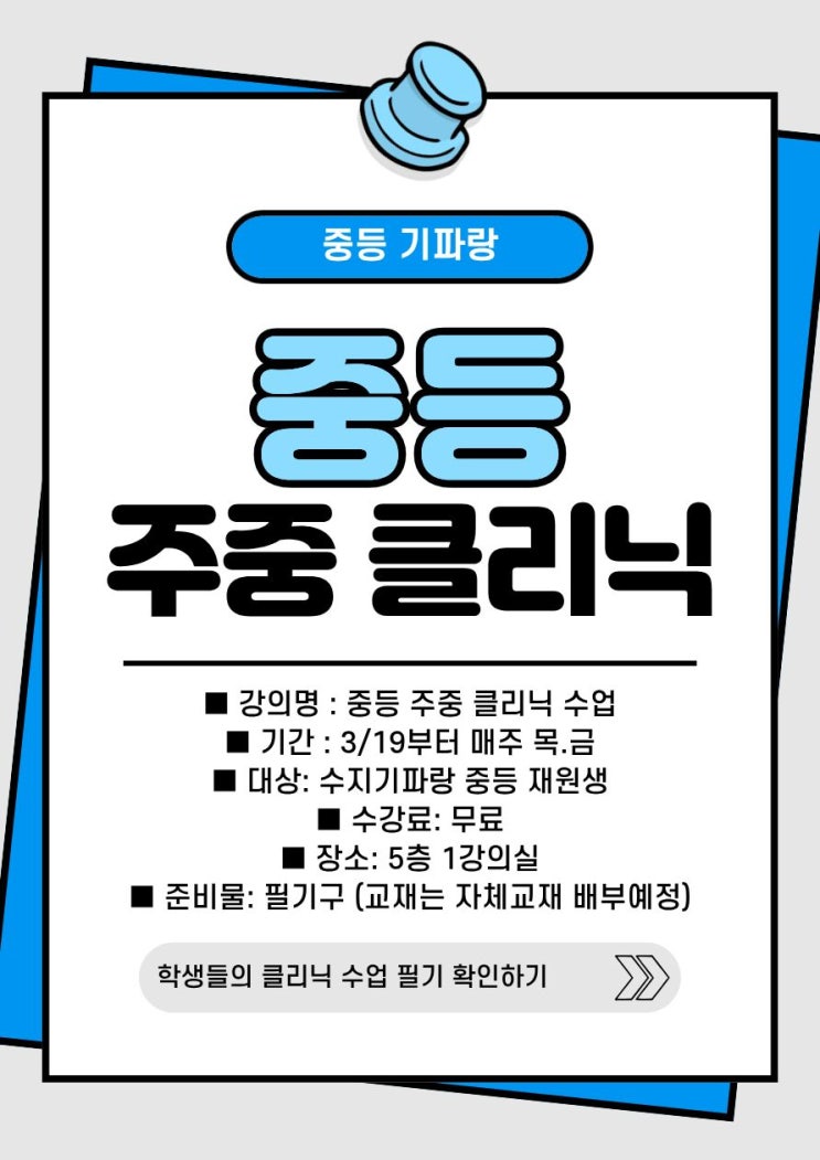 안녕하세요 :) 문해력에 파도를 일으키는 기파랑문해원 수지원입니다. 저희 기파랑문해원 수지원에서는 중등 재원생을 대상으로 ‘주중 클리닉 수업’을 진행하고 있습니다. 주중 클리닉 수업은 단순 자습이나 질의응답 시간이 아니라 정해진 시간에 학원에 등원하여 영상 기반으로 진행되는 보완 수업 형태로 운영됩니다. 문법·독서·문학 취약 영역 중심으로 진행되며 원장님 4대 특강 및 문법 특강 콘텐츠를 활용해 진행하고 있습니다. [중등 클리닉 수업 안내] 대상: 중등 재원생 장소: 5층 1강의실 수업료: 무료 준비물: 필기구 (교재는 자체교재 배부예정) 주중 클리닉은 앞으로도 계속 진행될 예정이니, 많은 관심과 신청 부탁드립니다....... <img src="https://blogthumb.pstatic.net/MjAyNjAzMjFfMjI3/MDAxNzc0MDY5NjM3ODkz.FnVm8urOt45V9ZNAZkxD04uBnSyFHHYj9w7DUjoOKYsg.b-lxixxrI-DzCOF8LtSrqz1a9UodvXgaaGbCcgwXkKUg.JPEG/1.jpg?type=s3" />