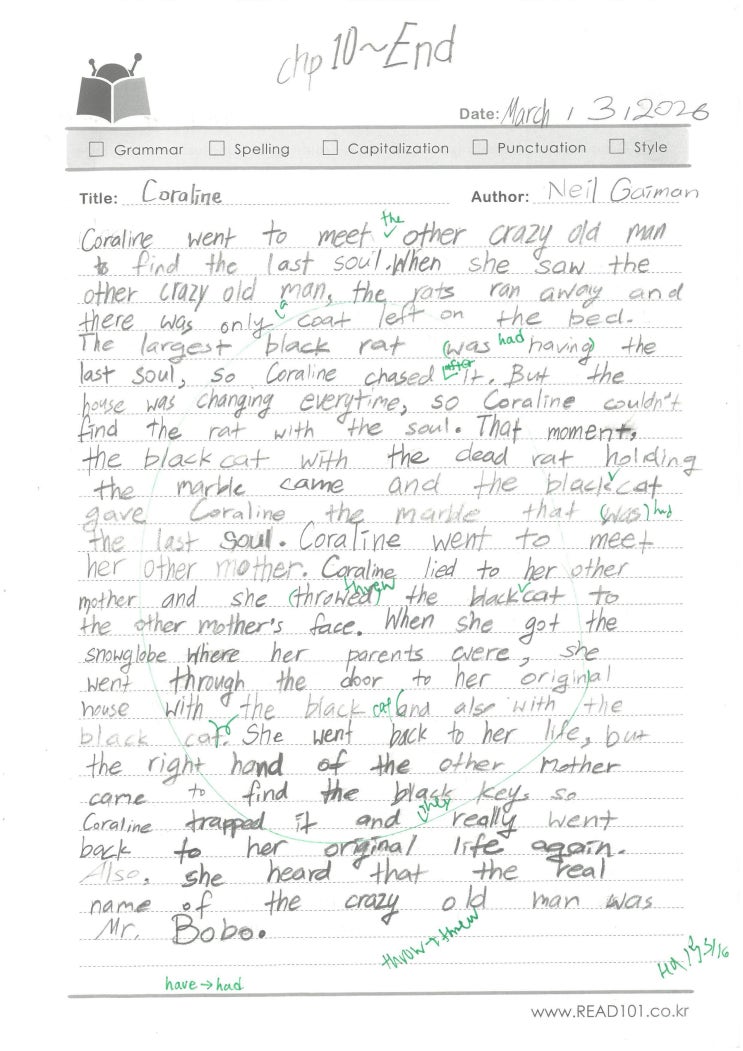 안녕하세요, 리드101 수지 신봉점입니다. 신봉초5 J****학생의 writing 입니다. https://www.instagram.com/read101_sinbong/ #리드101수지신봉 #리드101신봉 #신봉영어도서관 #신봉영어학원 #수지영어도서관 #수지영어학원 #수지 #신봉 #리드101 #writing #수지영어도서관 #영어리딩 #원서읽기 #영어원서 #영어책읽기 #신봉초영어 #신봉초 #성서초 #성복초 #효자초 #신일초 #홍천초 #신리초 #수지초 #영어라이팅 #READ101 <img src="https://blogthumb.pstatic.net/MjAyNjA0MDRfMjk1/MDAxNzc1Mjc5Njk3ODcy.KQjXbO8K5qDri_DMdpu4RO8gB9wx2m8BGJr3OVupIsIg.fntXcUC_lfLB32ICZQZoP1UiEDhL8gFwACz3hIe-bw0g.JPEG/%C0%CC%C0%E7%C7%F6Jaden_Coraline_26.03.03.jpg?type=s3" />