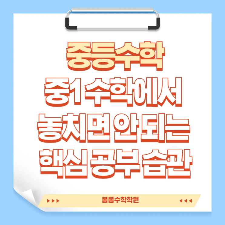 성복동 중등수학학원, 중1 수학에서 놓치면 안 되는 핵심 공부 습관 안녕하세요. 봄봄수학학원입니다. 중1이 되면 수학 공부 시간이 늘어나고, 문제 양도 많아집니다. 그런데 공부를 오래 한다고 해서 반드시 실력이 바로 올라가는 것은 아닙니다. 특히 1학기에는 초등수학과는 다른 방식으로 공부해야 하는 시기이기 때문에, 처음 방향을 어떻게 잡느냐가 정말 중요합니다. 오늘은 봄봄수학학원에서 중등수학 학습에 꼭 필요한 핵심 포인트를 정리해보려고 합니다. 겉으로는 사소해 보이지만, 실제로는 점수와 실력 차이를 만드는 내용들입니다. 1. 수학은 “글씨와 풀이과정”부터 달라야 합니다 중등수학에서 가장 먼저 잡아야 하는 것은 의외....... <img src="https://blogthumb.pstatic.net/MjAyNjA0MDVfNDQg/MDAxNzc1MzE2NzIyMzM2.GhyOdo-OvbQKOgiinT7_0J7UjfrpLw9Wx4Jbc9gZGiYg.92n8r50vtYoWOWznPhtv3Jm91bdjhp6ha6ZDaVdKijog.PNG/%BA%BD%BA%BD%BC%F6%C7%D0%C7%D0%BF%F8-002.png?type=s3" />